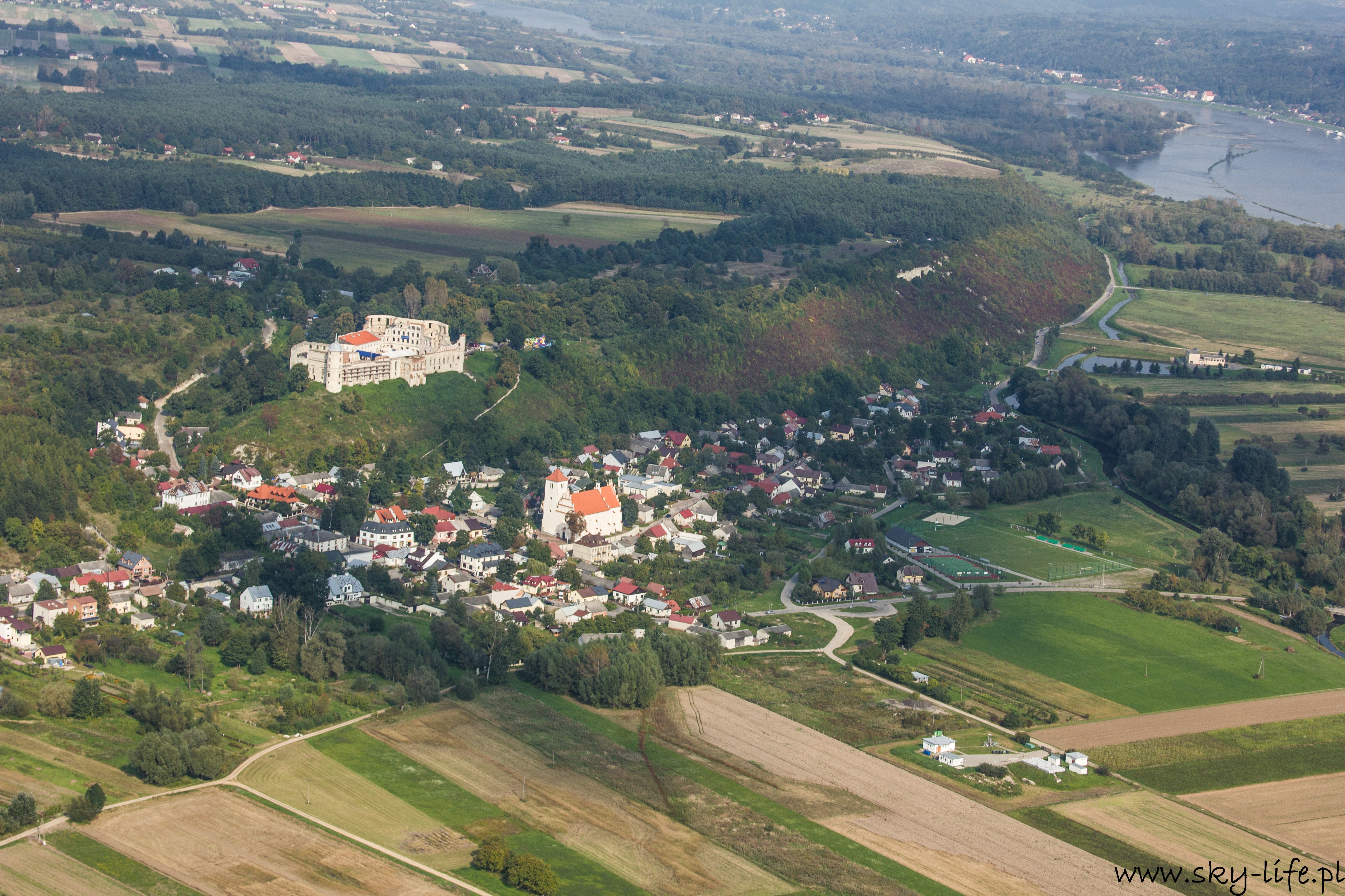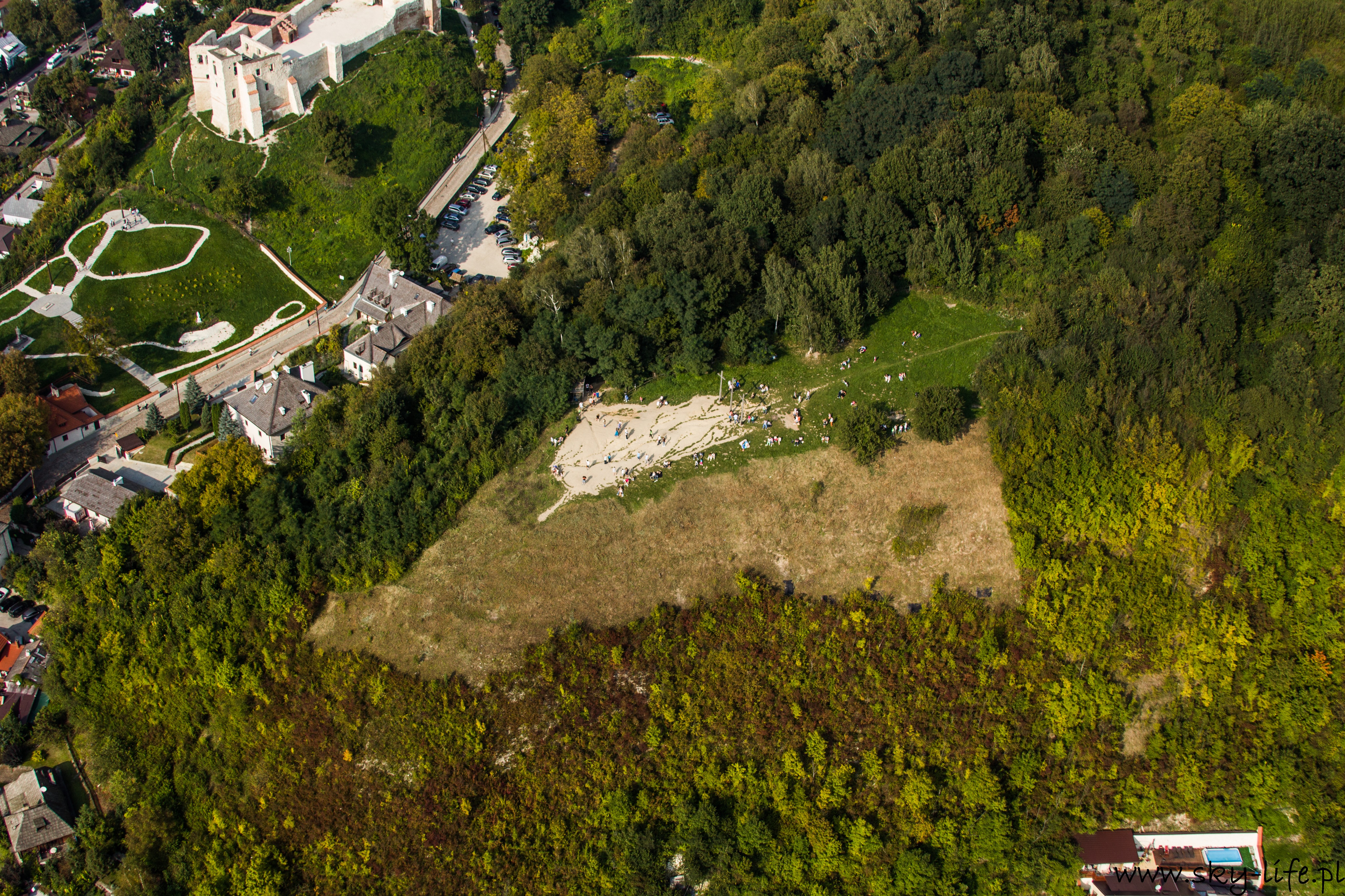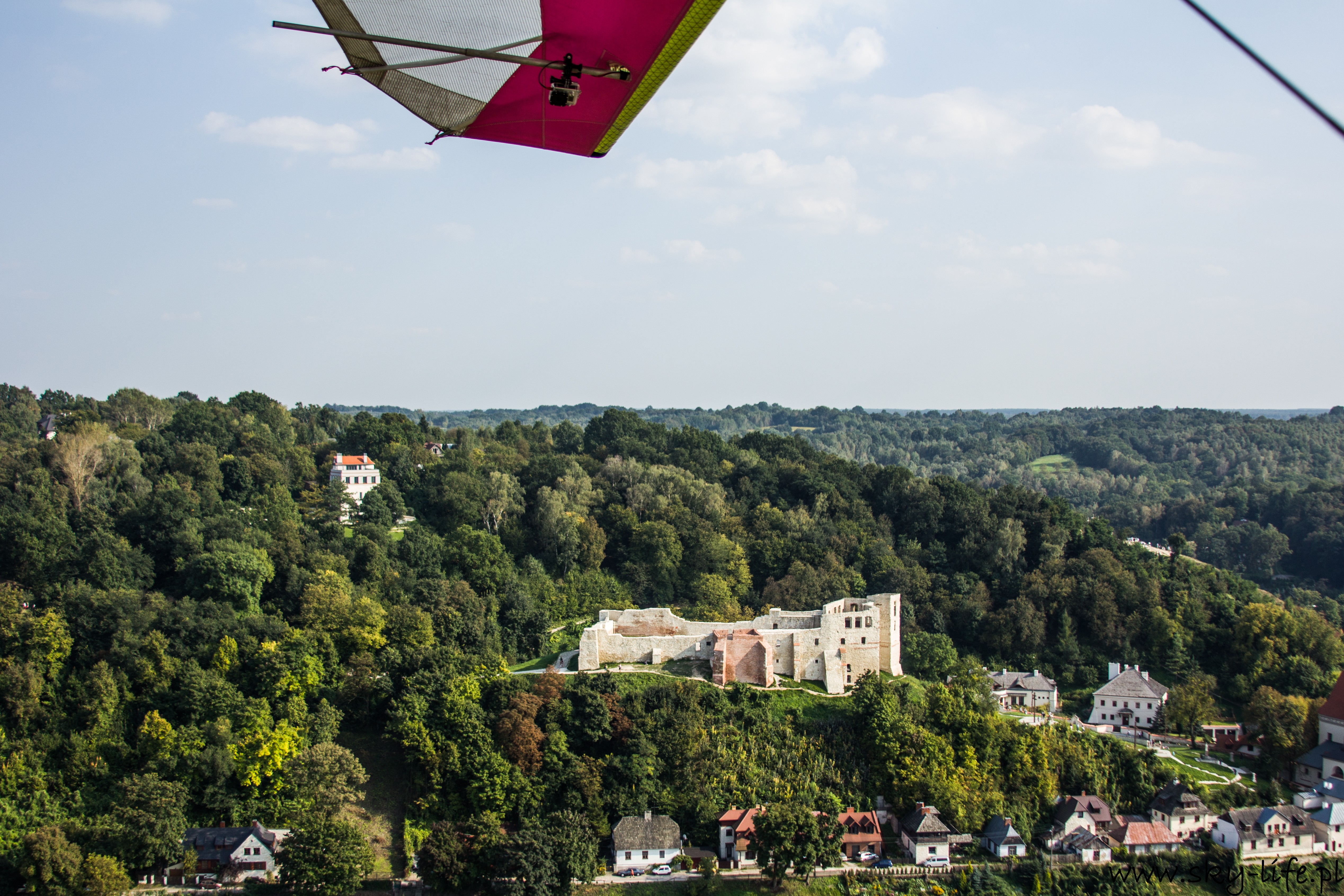 Start chwilę po 14-stej i już parę sekund po starcie da się wyczuć dość silną termikę – na zdjęciu po prawej stronie widać mocno zadarty przód motolotni, podczas gdy sterownica jest dość mocno ściągnięta, czyli w spokojnym powietrzu powinienem lecieć z delikatnym opadaniem, a w takich warunkach jak były, miałem około 2 m/s wznoszenia. Cała trasa była już spokojniejsza, owszem pojawiała się termika, ale bardzo delikatna – taka, żeby zużyć delikatnie mniej paliwa korzystając z noszeń. Niestety widoczność nie była bardzo dobra – pozioma sięgała 6-7 km, utrudniało to trochę nawigację. Po prawie 1h lotu byłem już w Janowcu. W planie lotu miałem zagospodarowane 20 minut na krążenie wokół Kazimierza i ten czas wykorzystałem na robienie zdjęć, które zamieszczam poniżej. Kazimierz Dolny jak chyba w każdy weekend był pełny ludzi, ale to na prawdę pełny – nawet z góry trudno byłoby znaleźć miejsce żeby wcisnąć samochód.