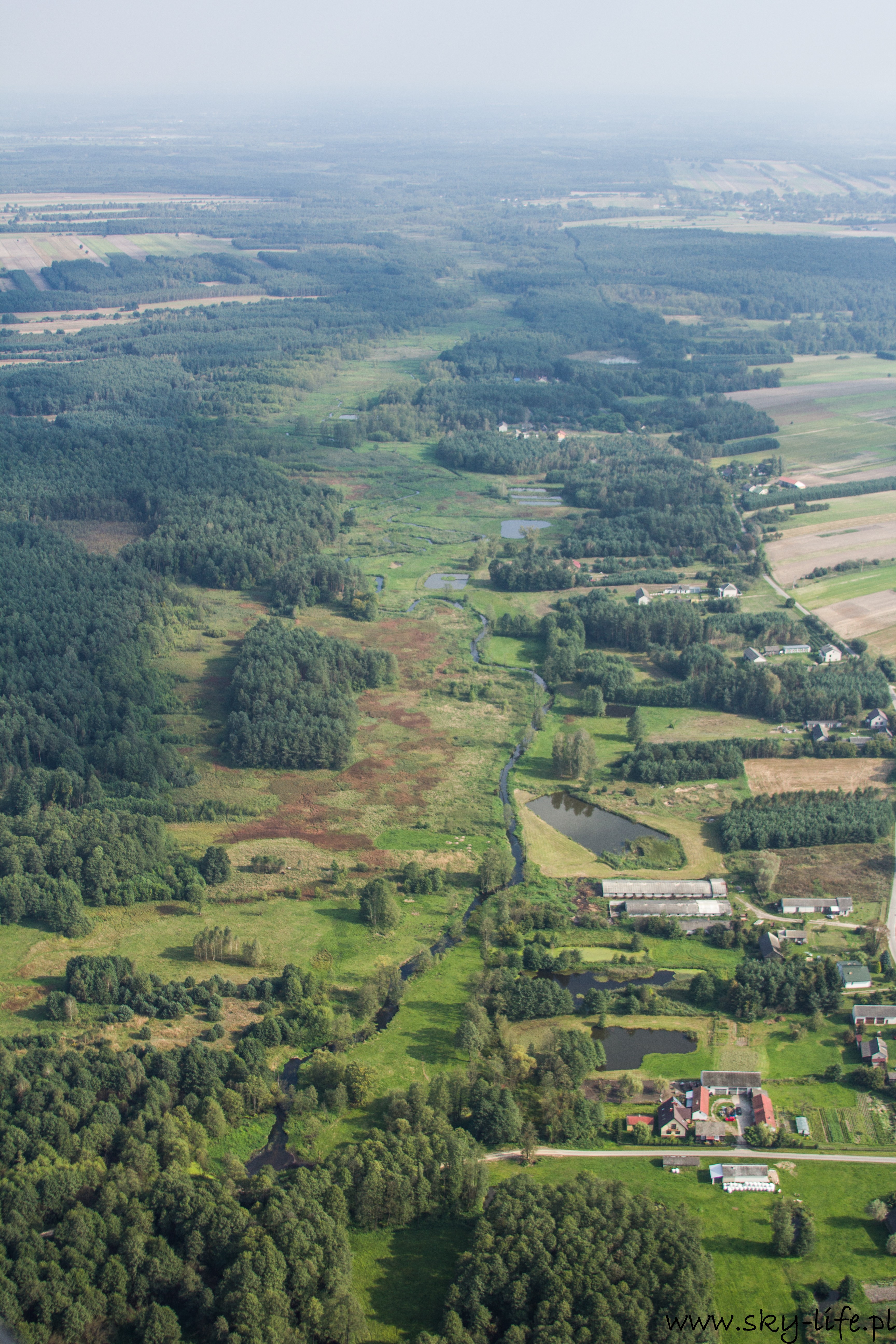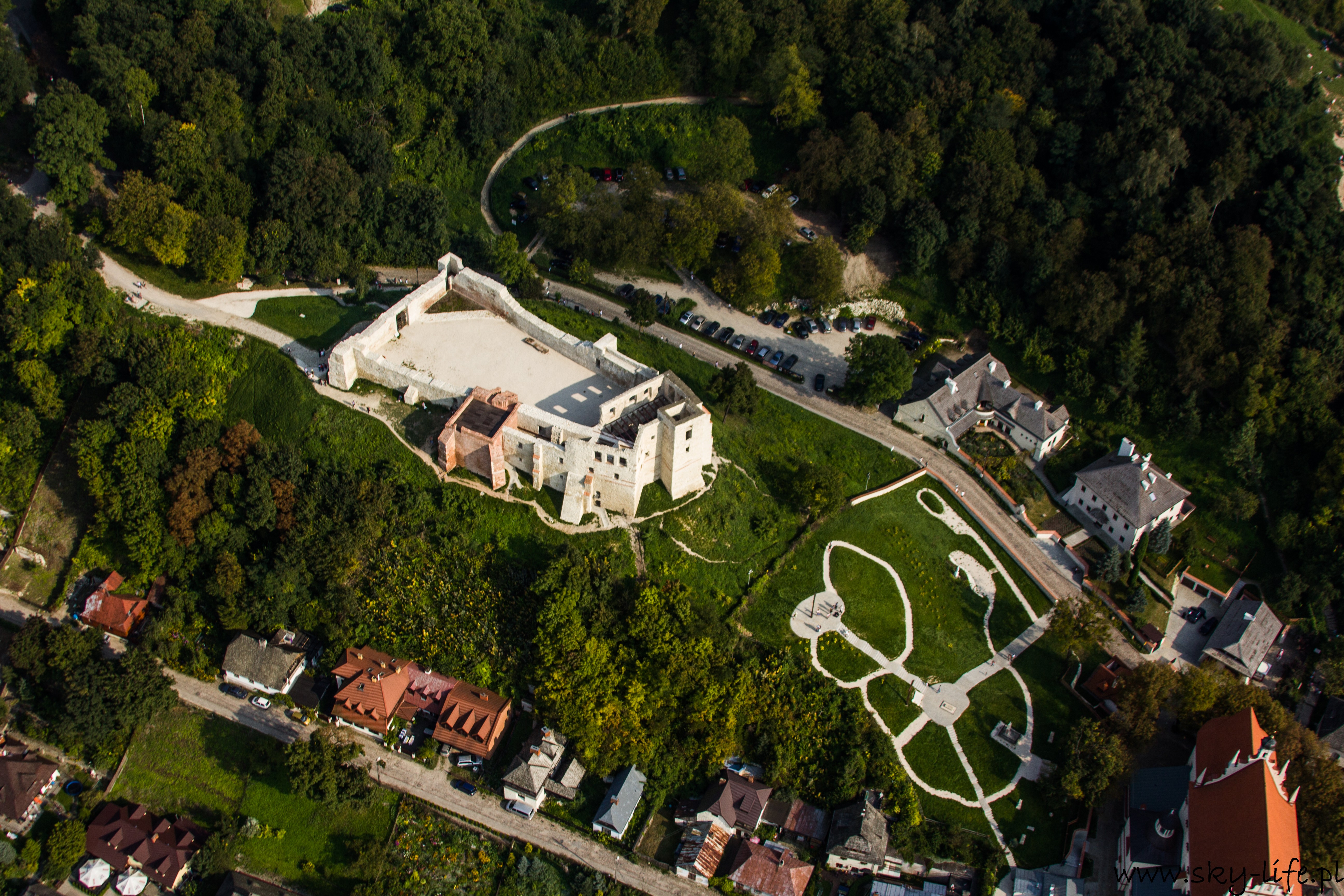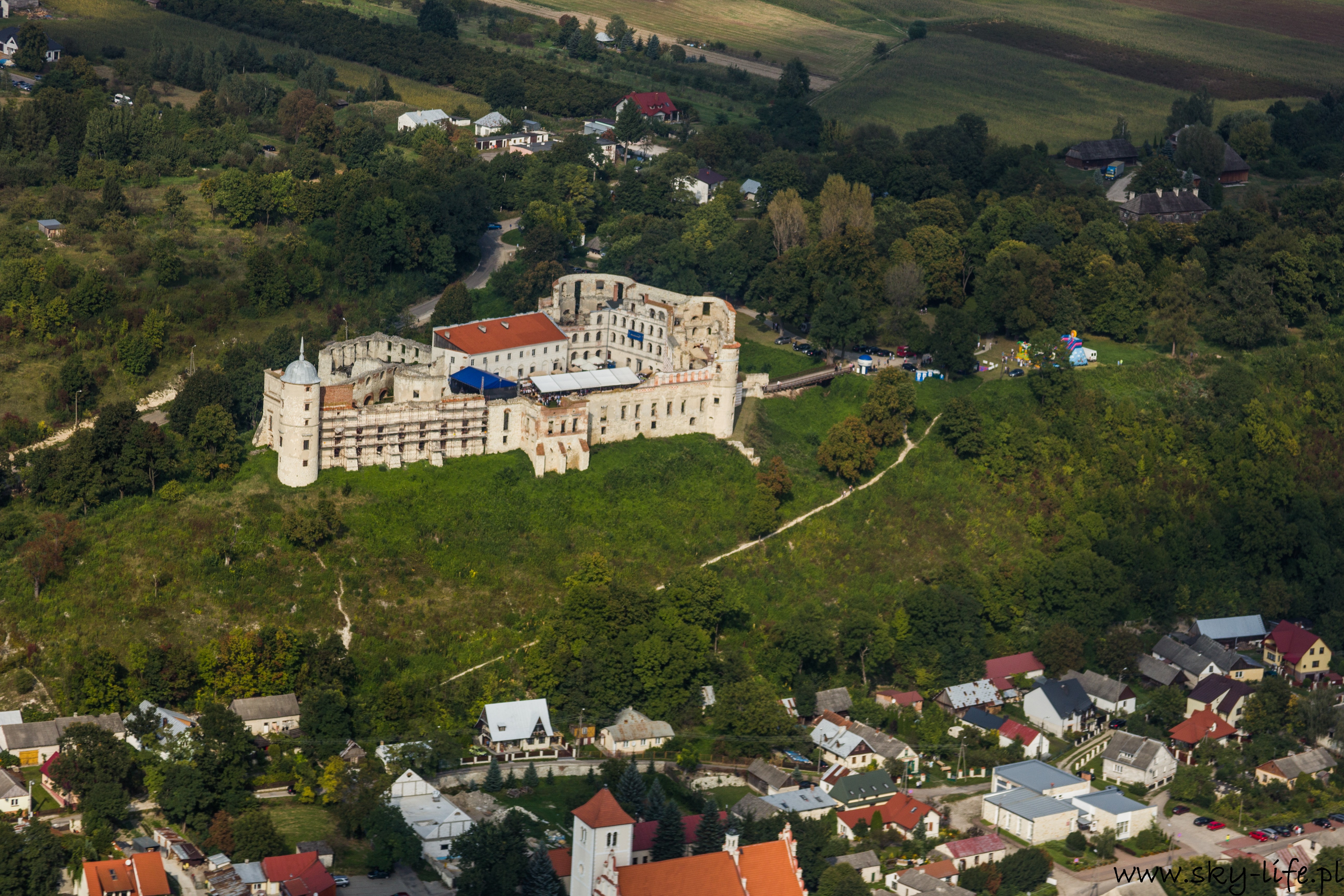 Start chwilę po 14-stej i już parę sekund po starcie da się wyczuć dość silną termikę – na zdjęciu po prawej stronie widać mocno zadarty przód motolotni, podczas gdy sterownica jest dość mocno ściągnięta, czyli w spokojnym powietrzu powinienem lecieć z delikatnym opadaniem, a w takich warunkach jak były, miałem około 2 m/s wznoszenia. Cała trasa była już spokojniejsza, owszem pojawiała się termika, ale bardzo delikatna – taka, żeby zużyć delikatnie mniej paliwa korzystając z noszeń. Niestety widoczność nie była bardzo dobra – pozioma sięgała 6-7 km, utrudniało to trochę nawigację. Po prawie 1h lotu byłem już w Janowcu. W planie lotu miałem zagospodarowane 20 minut na krążenie wokół Kazimierza i ten czas wykorzystałem na robienie zdjęć, które zamieszczam poniżej. Kazimierz Dolny jak chyba w każdy weekend był pełny ludzi, ale to na prawdę pełny – nawet z góry trudno byłoby znaleźć miejsce żeby wcisnąć samochód.