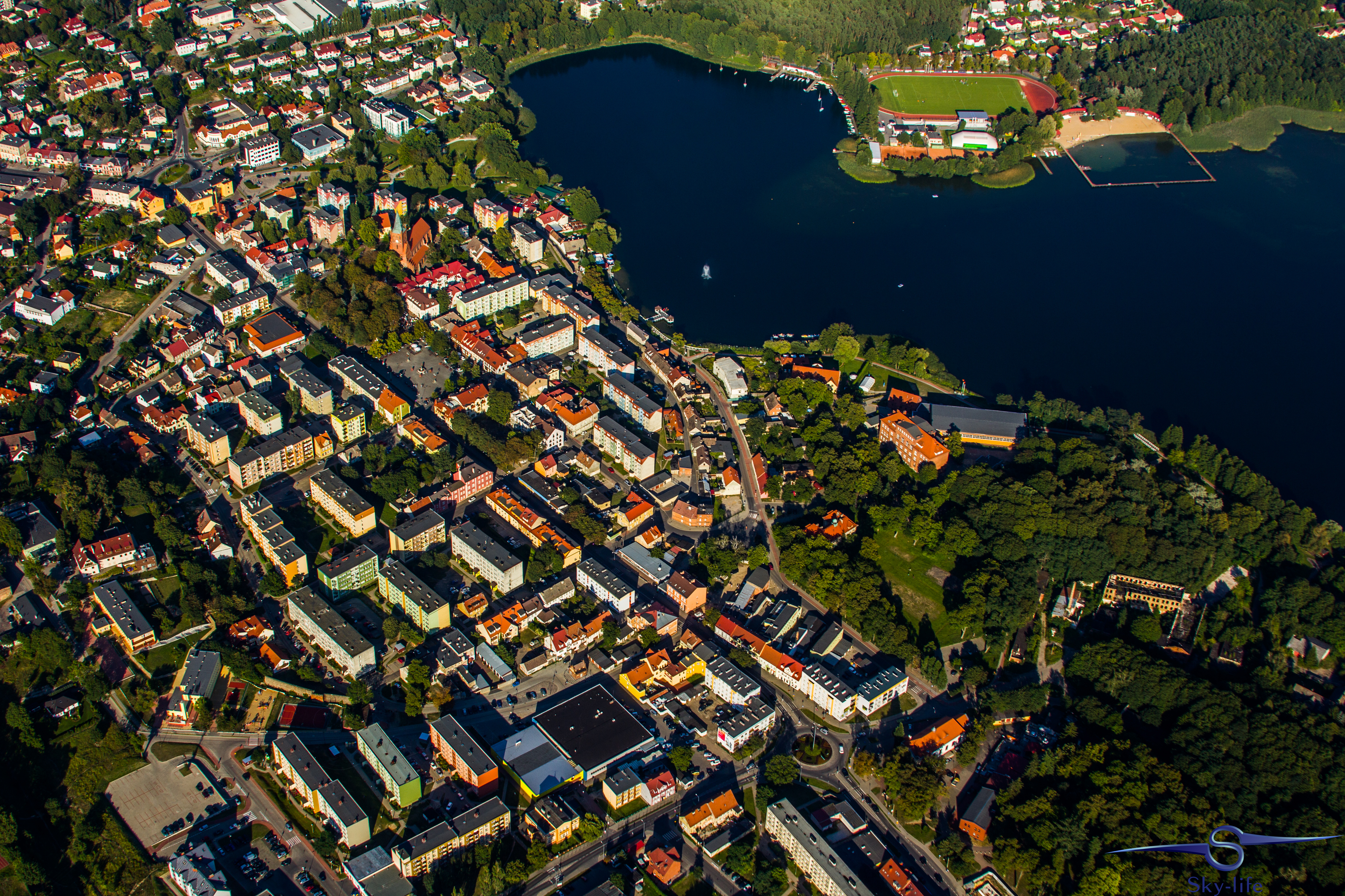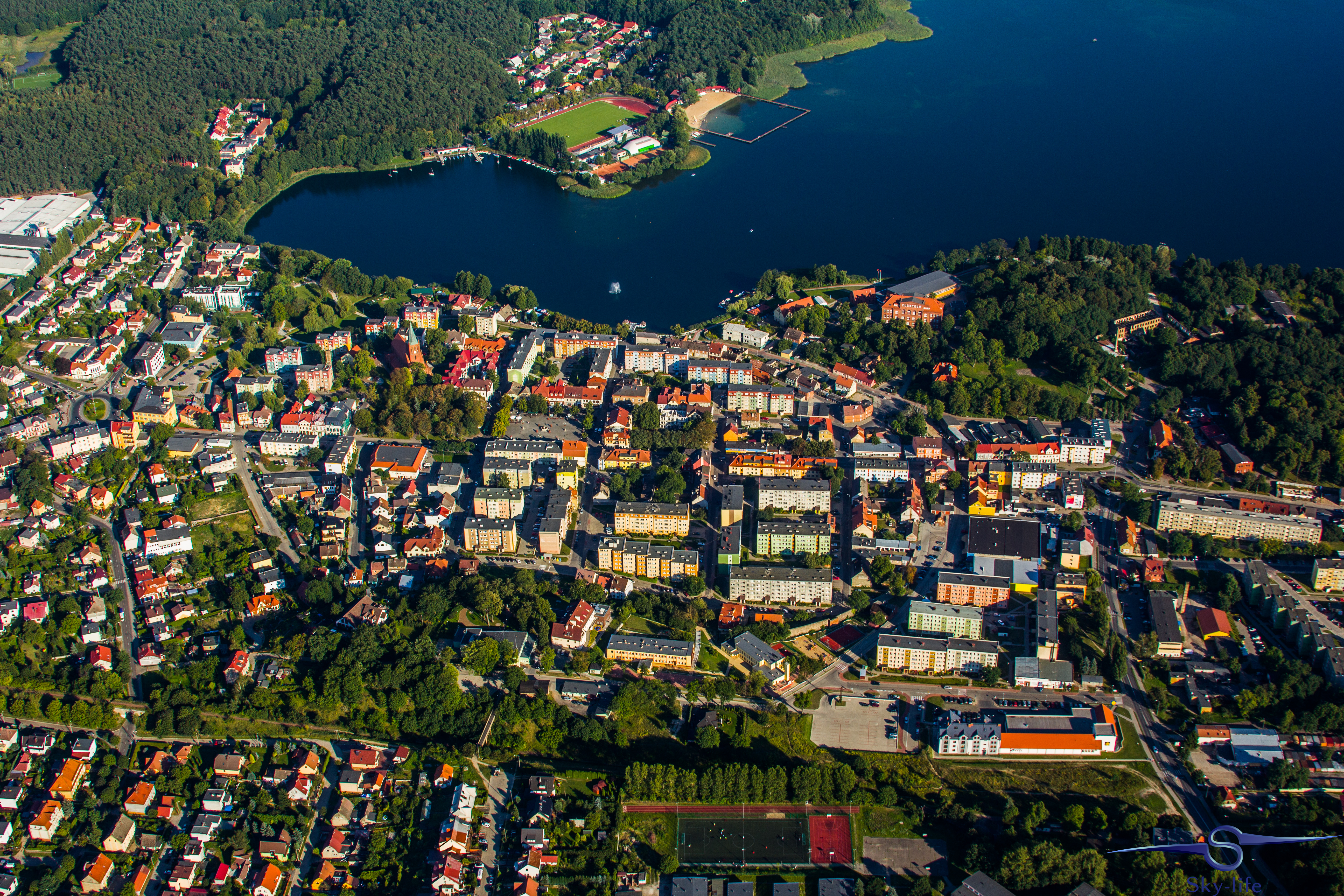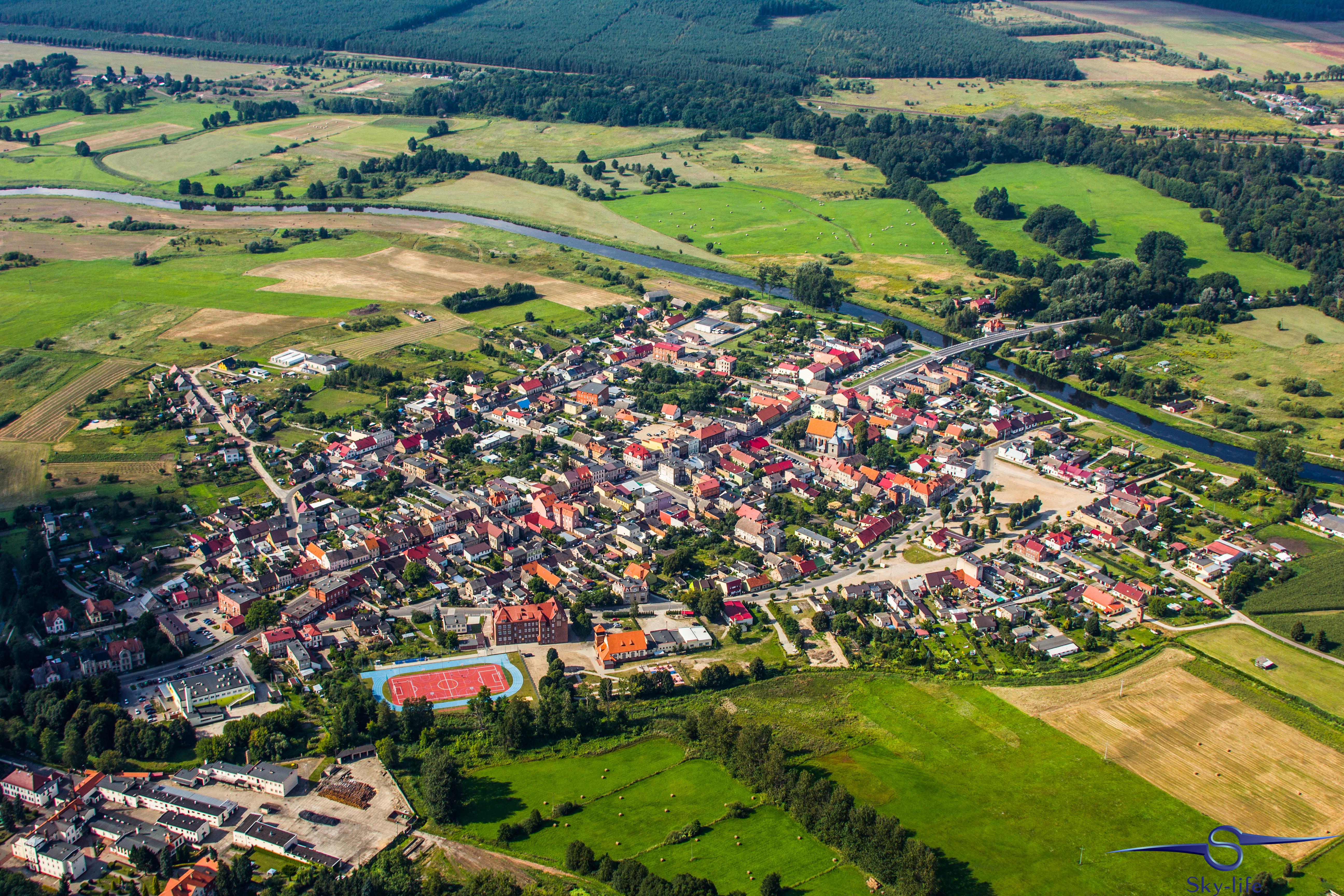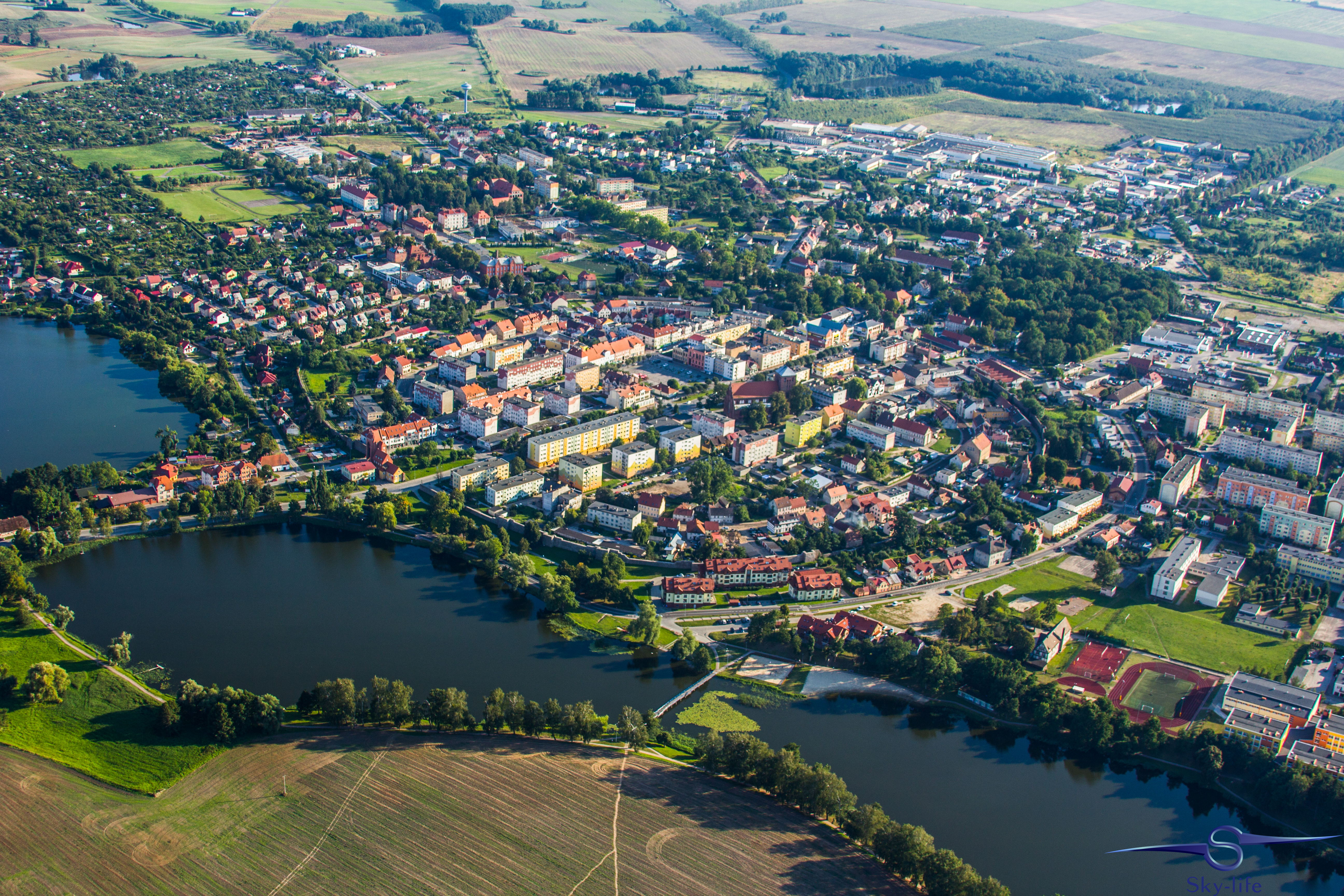 Jeszcze tego samego dnia wybrałem się odwiedzić kolejne województwo: zachodnio-pomorskie. A konkretnie urokliwe miasto w jego południowej części – Barlinek. Zależało mi na tym szczególnie, gdyż właśnie stamtąd pochodzi moja rodzina. A jak już tu jestem to przelecenie dodatkowych 100km nie zrobi mi różnicy, tym bardziej, że tak jak wspominałem – dzięki gościnności OSL Oborniki jestem zatankowany pod sam korek. Wybór trasy już był znacznie łatwiejszy – przez Sztrzelce Krajeńskie, wschodnią stroną Barlinecko-Gorzowskiego Parku Krajobrazowego aż do samego Barlinka. Nad miastem kilka kręgów na znacznej wysokości (około 1000m) i powrót tą samą drogą. Muszę przyznać, że Barlinek widziany z powietrza jest chyba jeszcze ładniejszy niż widziany z ziemi. Poniżej kilka zdjęć.