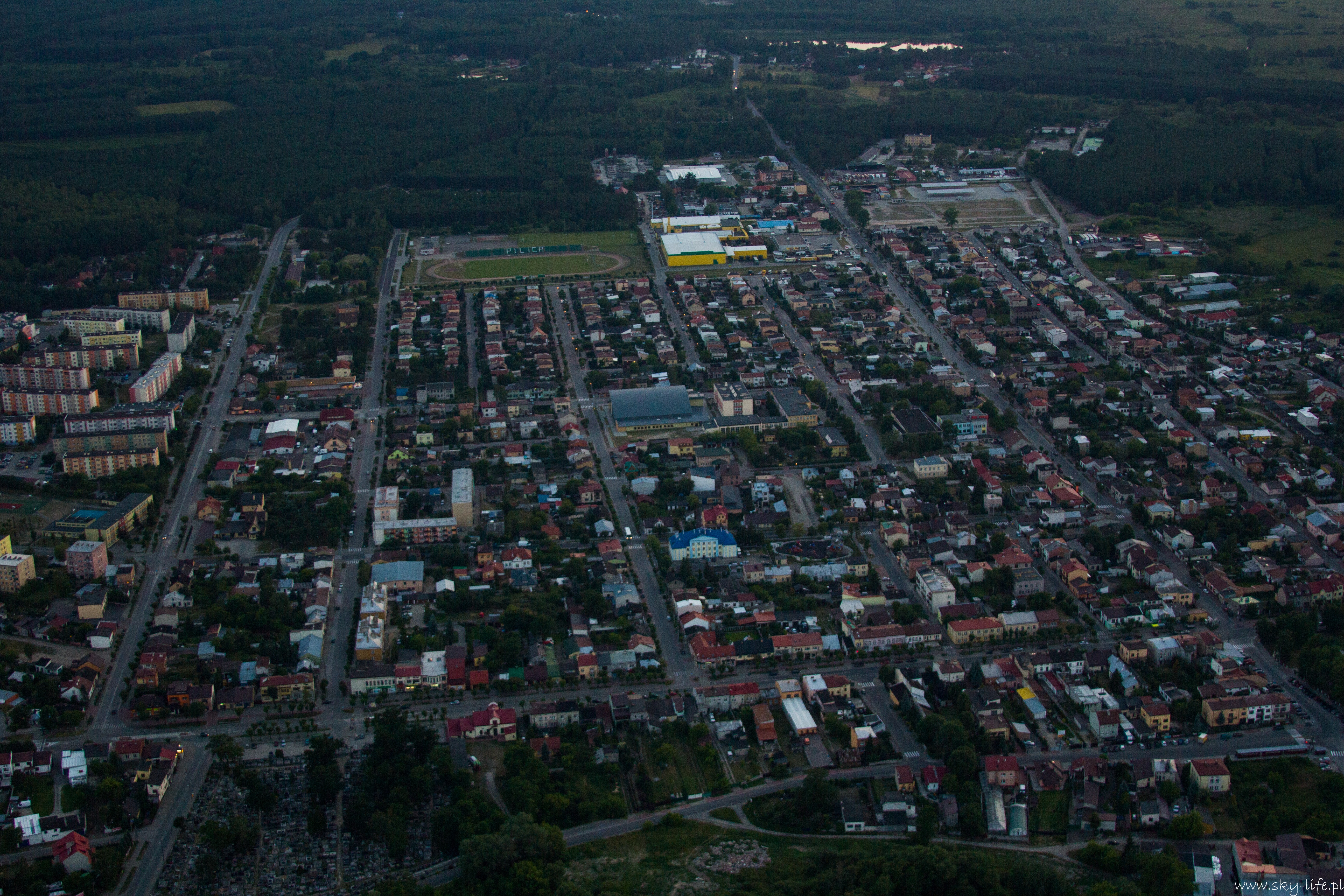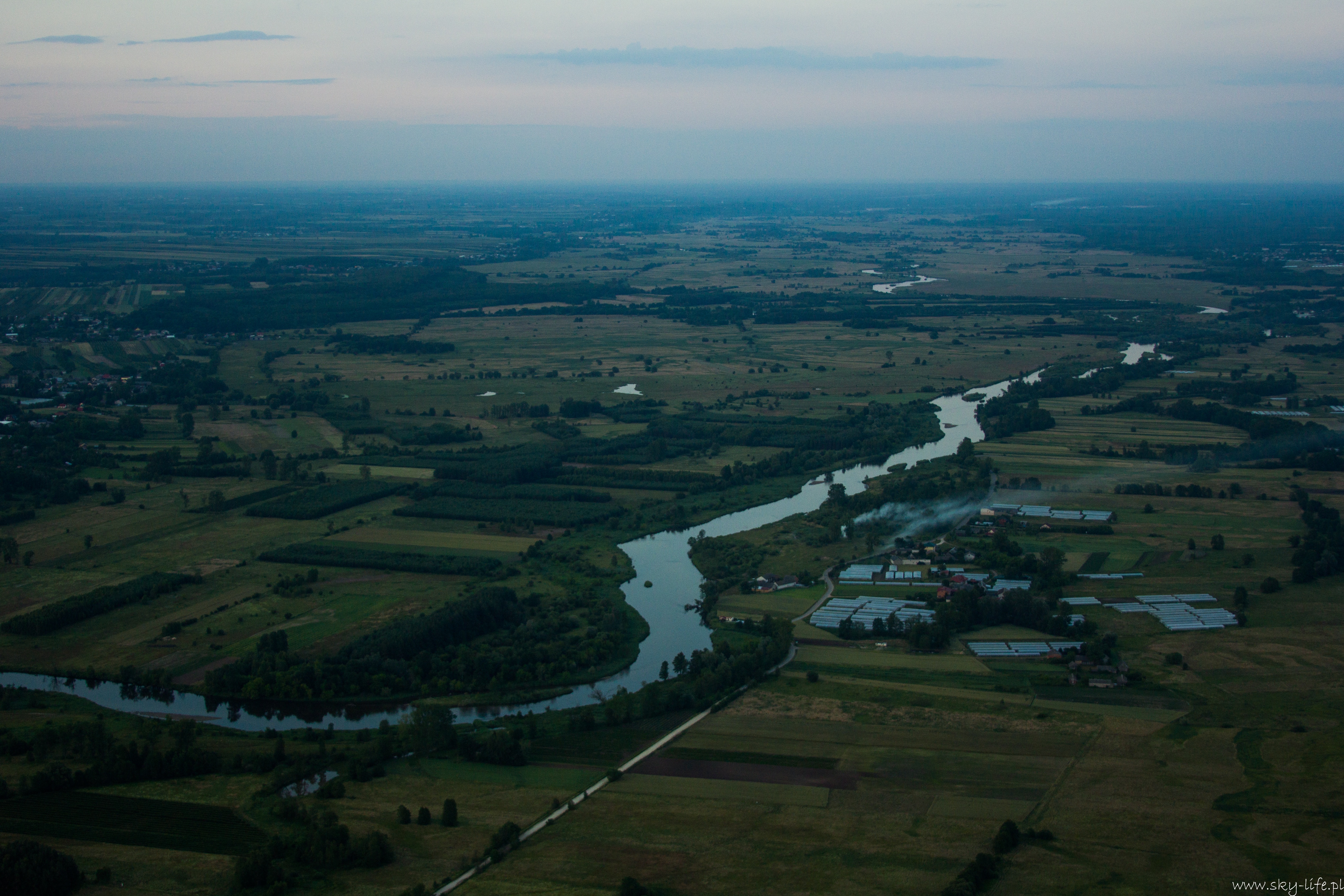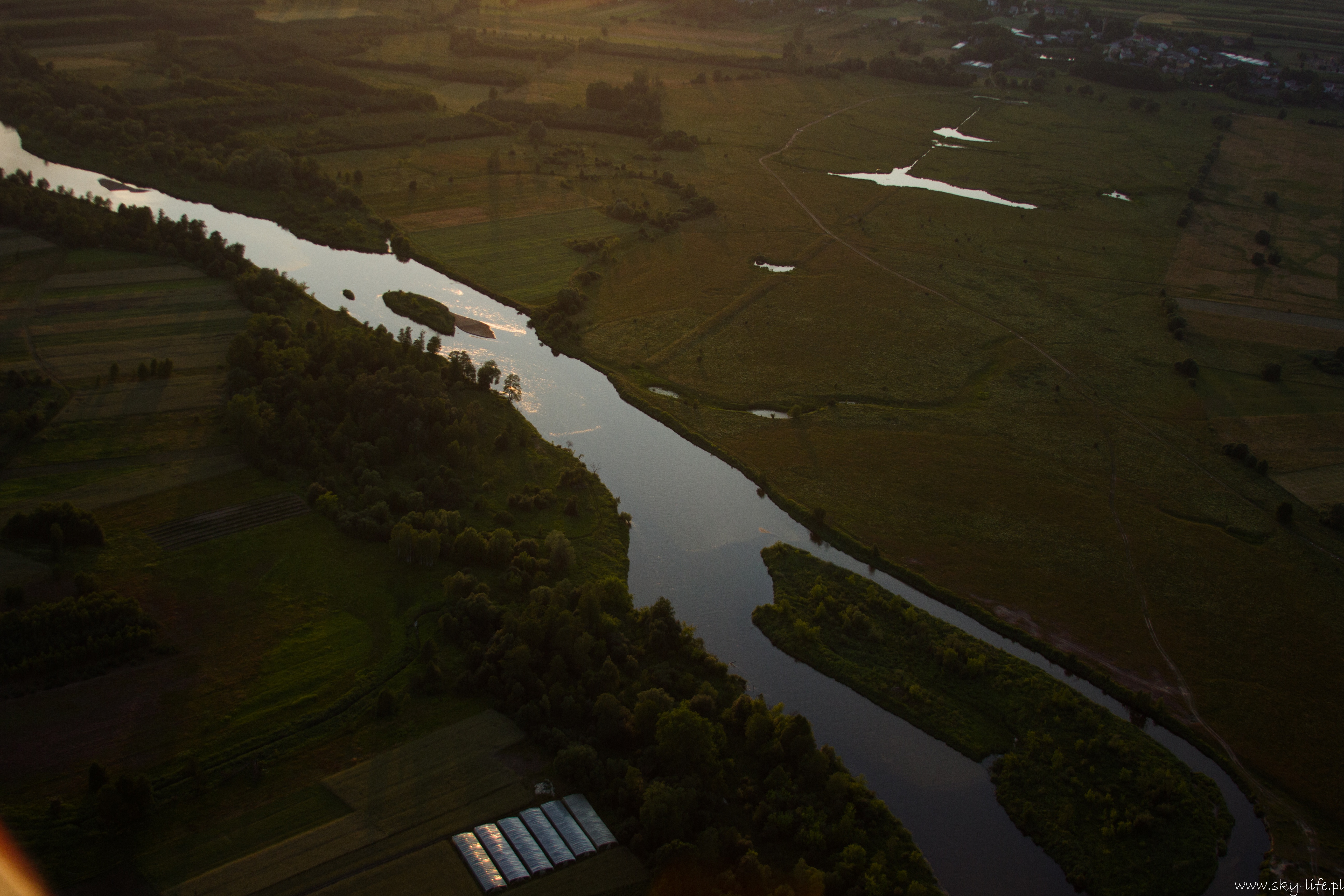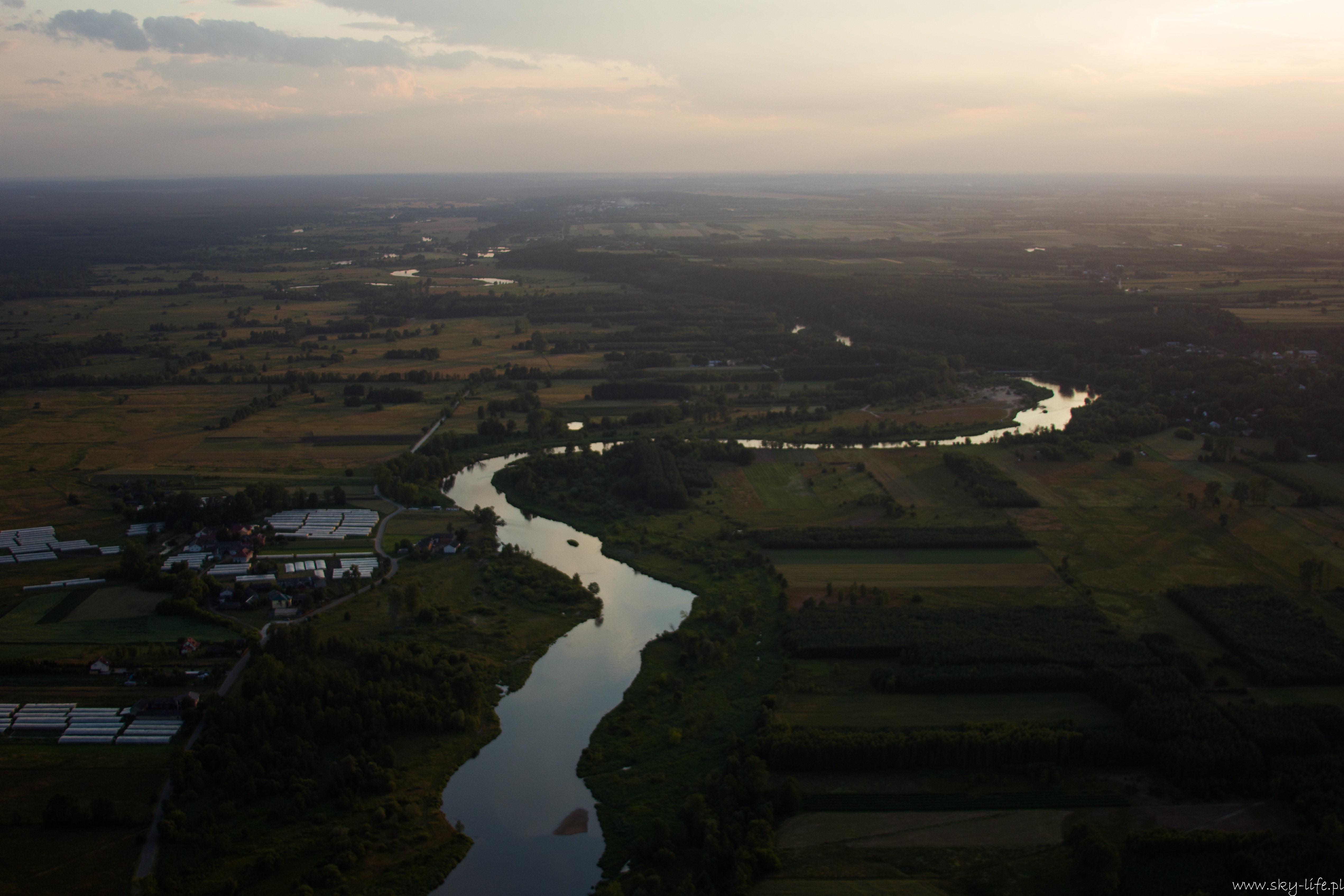 2014.06.24 – W końcu okienko pogodowe! Przez prawie tydzień pogoda w ogóle nie dopisywała – silny wiatr uniemożliwiał bezpieczne latanie. Dzisiaj w końcu na tyle się uspokoiło, że udało się polecieć w prawie 2h trasę. Na lotnisku byłem około 18-stej. Ruch jak w ulu – widocznie nie tylko ja długo oczekiwałem na pogodę. Na pasie kilka szybowców, kilka już w górze, do tego kilka samolotów no i ja w kolejce na start. Wystartowałem około 19-stej. Pomimo tego, że na ziemi prawie bez wiatru (2 m/s) to w górze już inaczej – wieje i to dość mocno, na szczęście nie ma porywów i termiki, więc po prostu wolniej się leci, a że mój kurs był dokładnie pod wiatr, to poruszałem się względem ziemi o połowę wolniej niż na zegarach. Według wstępnych założeń miałem lecieć wzdłuż Radomki do Zalewu w Domaniowie. Normalnie tą trasę bym pokonał w 15 minut, dzisiaj z uwagi na wiatr zajęło mi to dwa razy dłużej – dobrze, że zatankowałem do pełna. Rundka wokół Zalewu i pomyślałem, że warto by odwiedzić Nowe Miasto nad Pilicą – trasę powinienem pamiętać – GPS i mapy zostawiłem na lotnisku, bo miałem się tylko „przelecieć” po okolicy… Bogactwo krajobrazów mnie ponownie zaskoczyło – jak już wspominałem przy okazji lotu do Warki, że po północnej stronie Pilicy znajdują się praktycznie same sady, tak na trasie Domaniów -> Nowe Miasto krajobraz obfituje w… szklarnie – i to jeszcze ile! Ciągną się aż po horyzont.