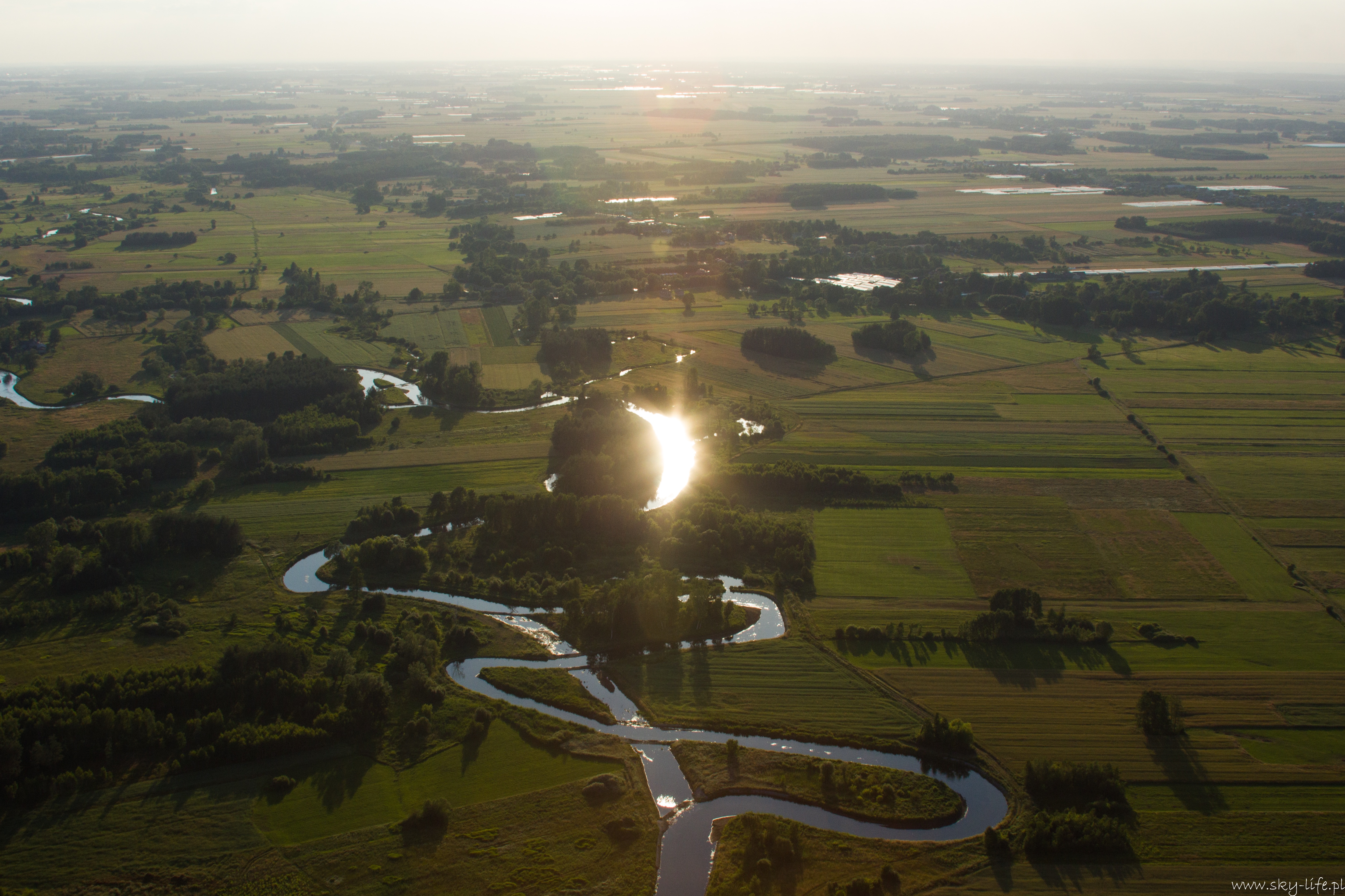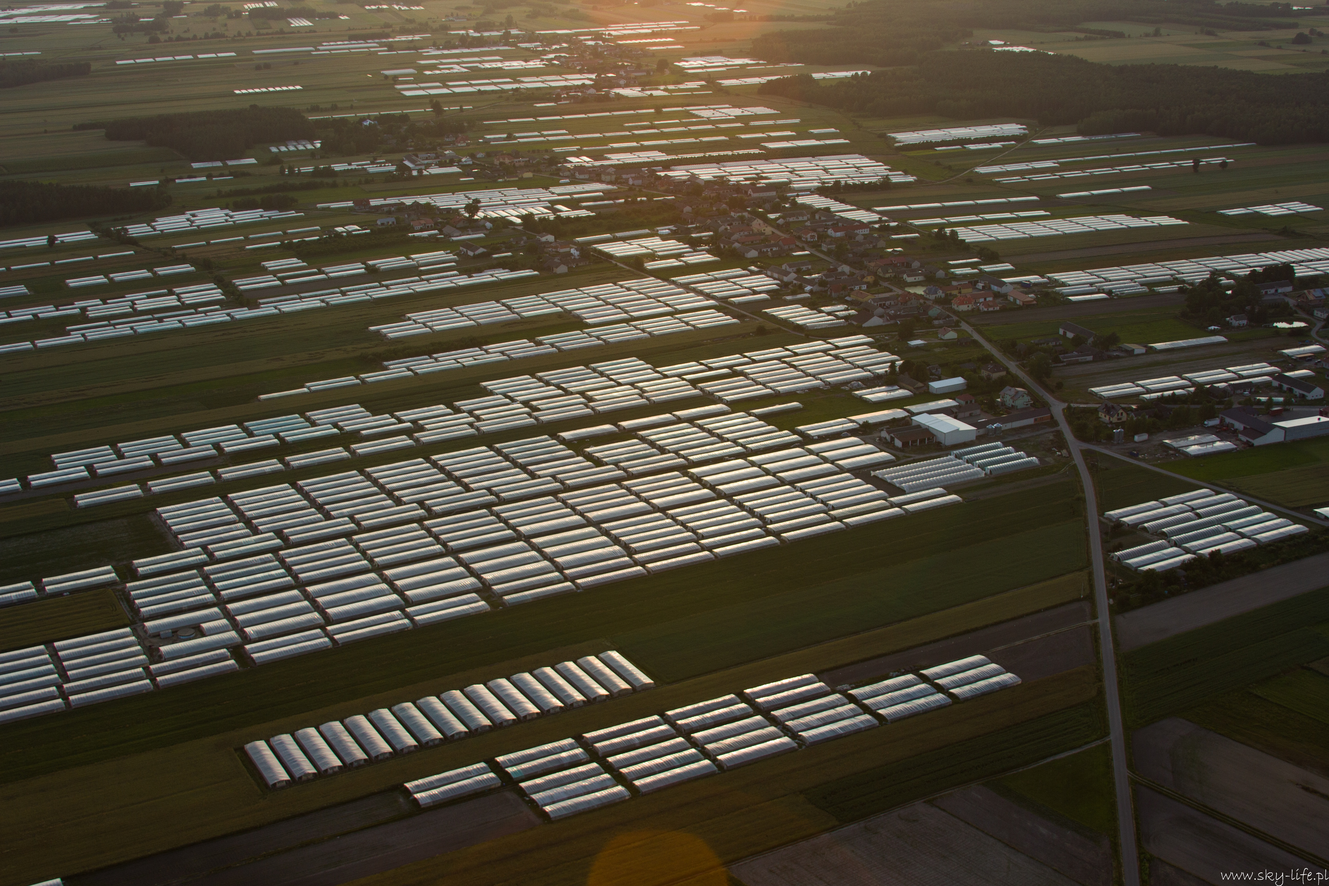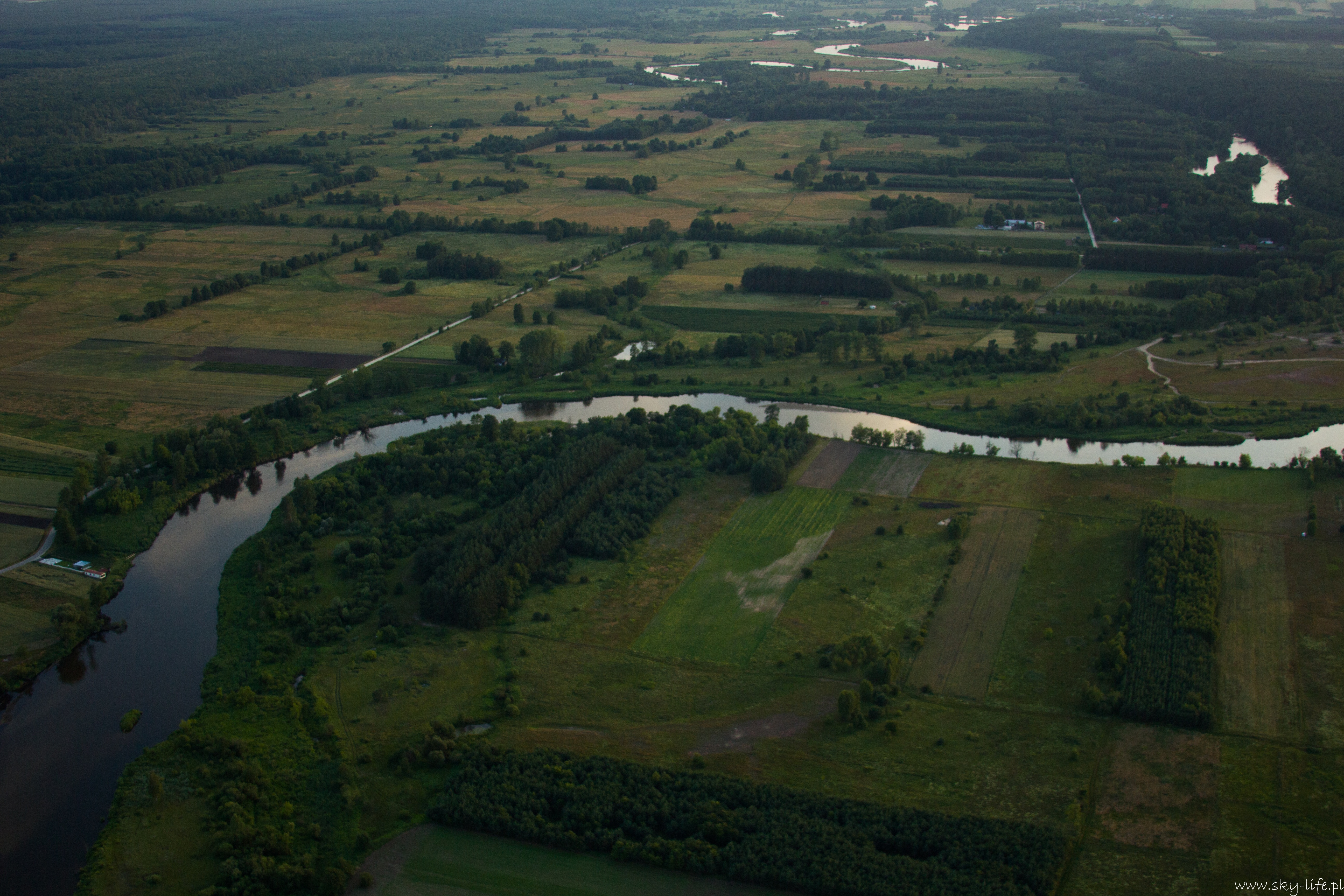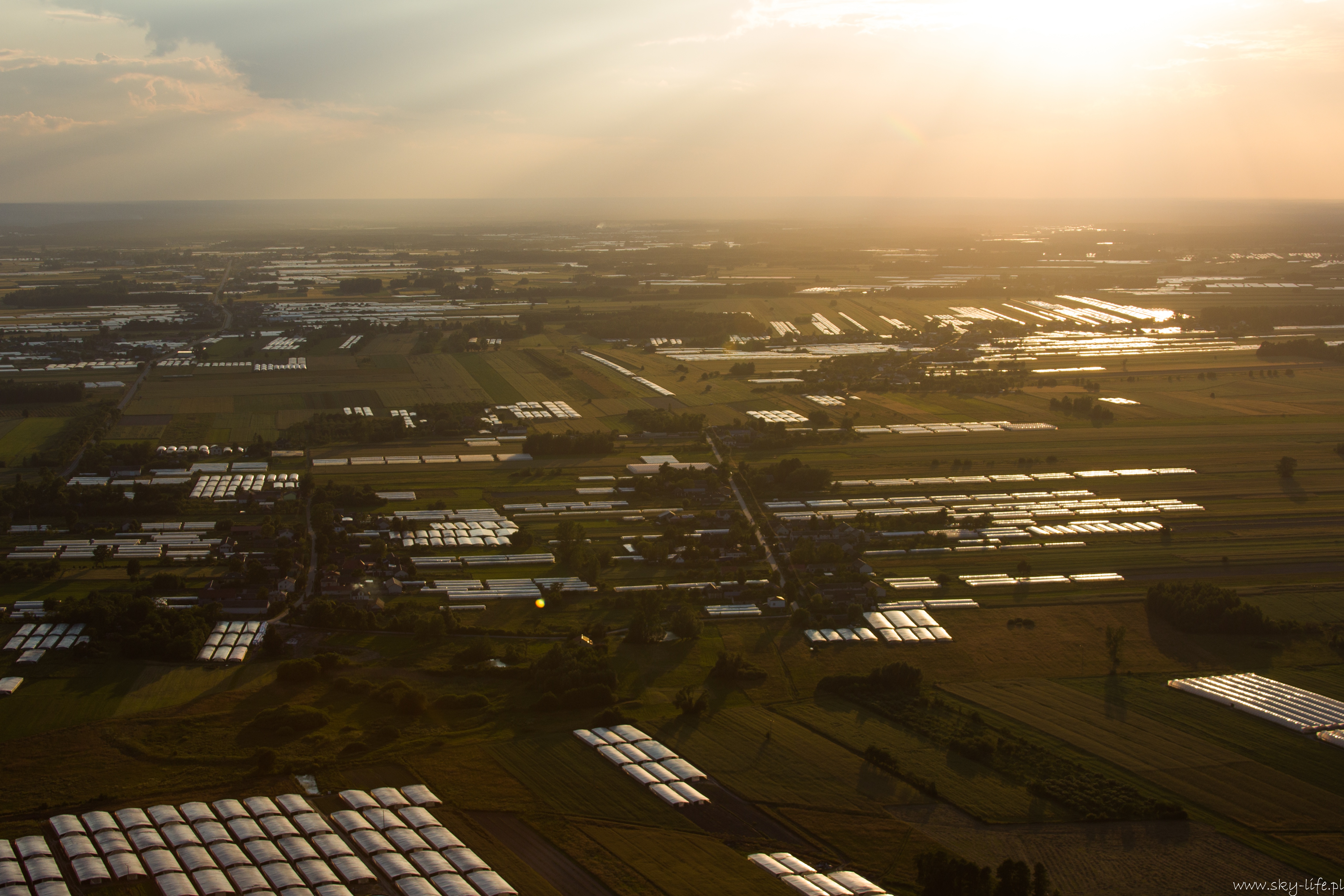 2014.06.24 – W końcu okienko pogodowe! Przez prawie tydzień pogoda w ogóle nie dopisywała – silny wiatr uniemożliwiał bezpieczne latanie. Dzisiaj w końcu na tyle się uspokoiło, że udało się polecieć w prawie 2h trasę. Na lotnisku byłem około 18-stej. Ruch jak w ulu – widocznie nie tylko ja długo oczekiwałem na pogodę. Na pasie kilka szybowców, kilka już w górze, do tego kilka samolotów no i ja w kolejce na start. Wystartowałem około 19-stej. Pomimo tego, że na ziemi prawie bez wiatru (2 m/s) to w górze już inaczej – wieje i to dość mocno, na szczęście nie ma porywów i termiki, więc po prostu wolniej się leci, a że mój kurs był dokładnie pod wiatr, to poruszałem się względem ziemi o połowę wolniej niż na zegarach. Według wstępnych założeń miałem lecieć wzdłuż Radomki do Zalewu w Domaniowie. Normalnie tą trasę bym pokonał w 15 minut, dzisiaj z uwagi na wiatr zajęło mi to dwa razy dłużej – dobrze, że zatankowałem do pełna. Rundka wokół Zalewu i pomyślałem, że warto by odwiedzić Nowe Miasto nad Pilicą – trasę powinienem pamiętać – GPS i mapy zostawiłem na lotnisku, bo miałem się tylko „przelecieć” po okolicy… Bogactwo krajobrazów mnie ponownie zaskoczyło – jak już wspominałem przy okazji lotu do Warki, że po północnej stronie Pilicy znajdują się praktycznie same sady, tak na trasie Domaniów -> Nowe Miasto krajobraz obfituje w… szklarnie – i to jeszcze ile! Ciągną się aż po horyzont.