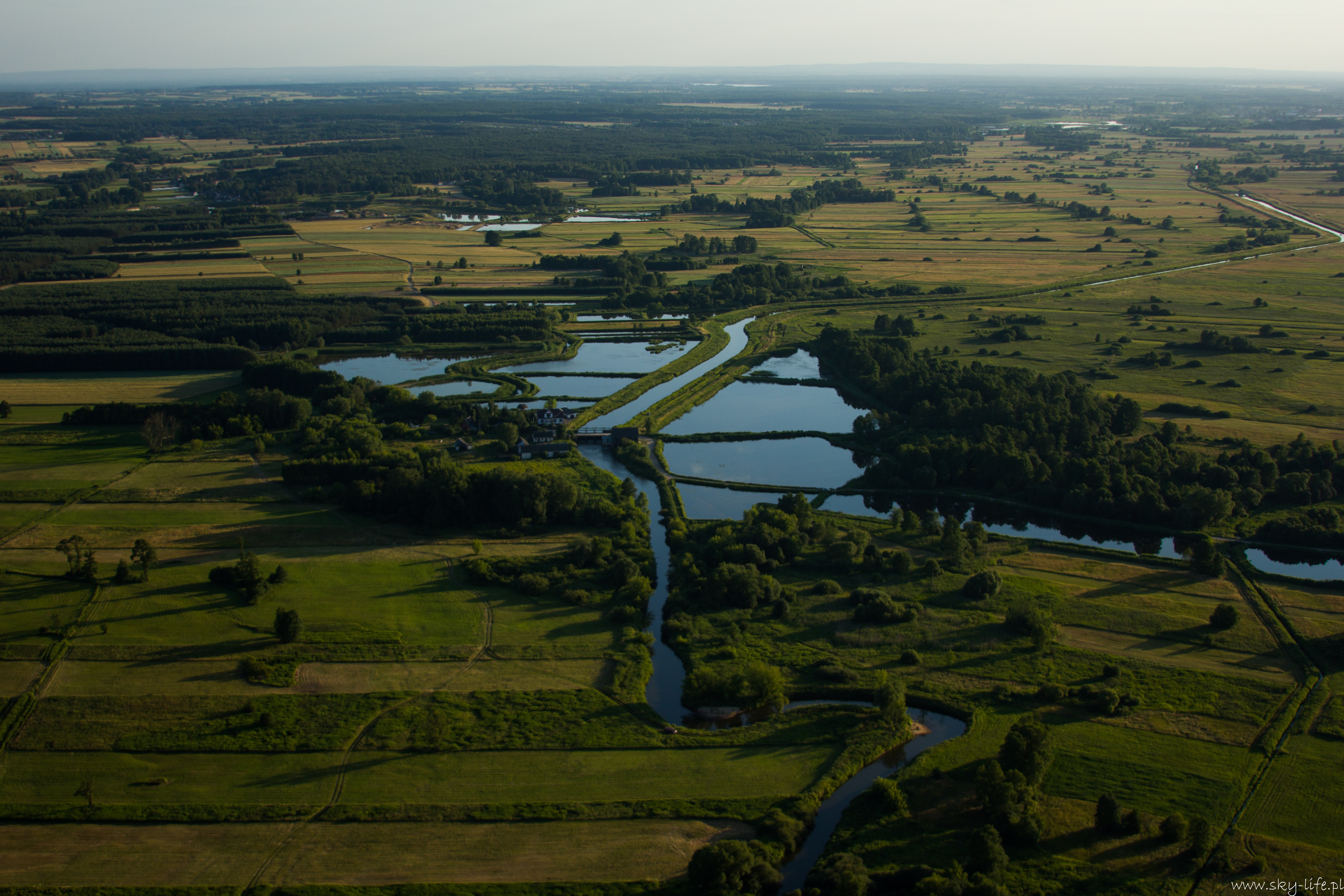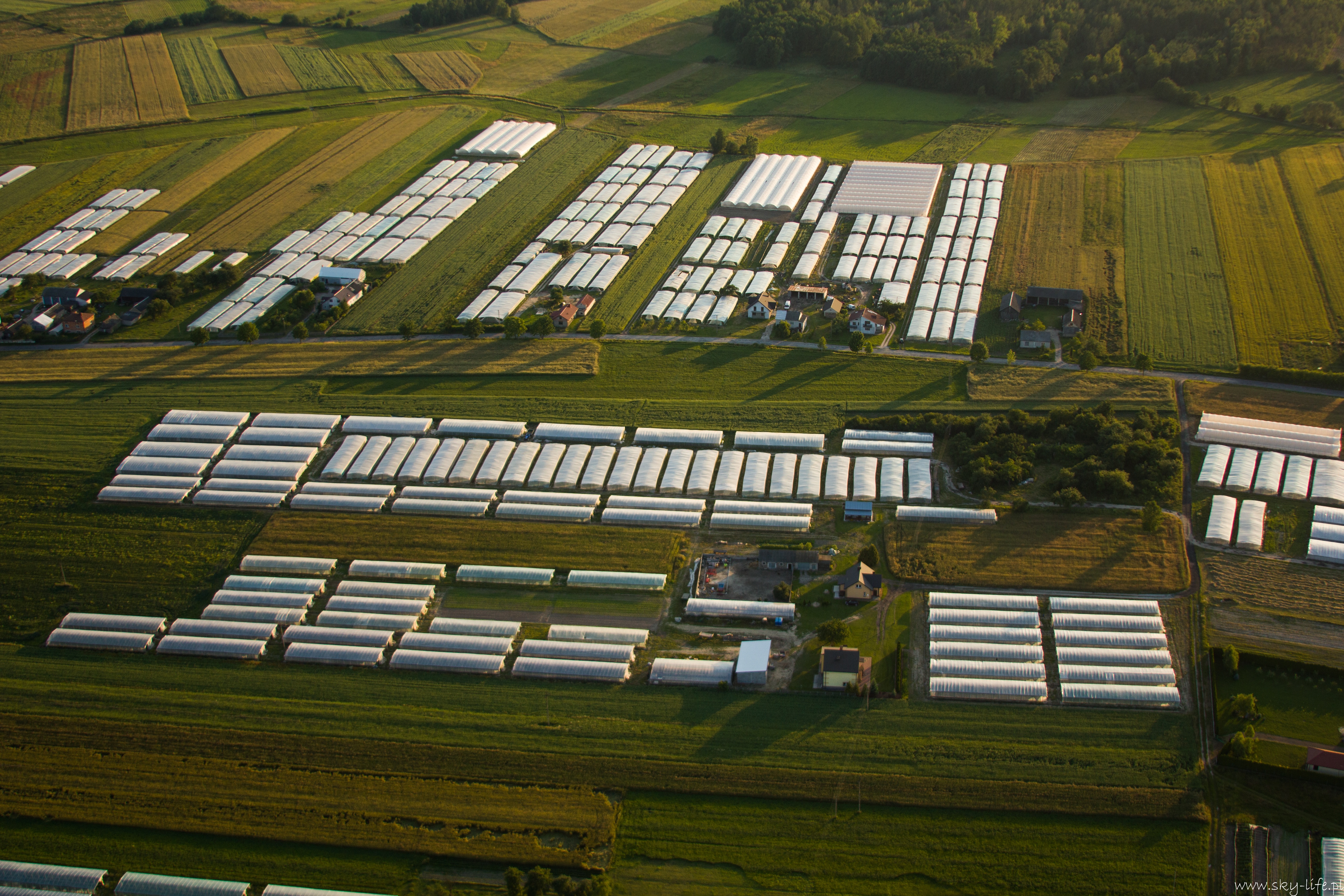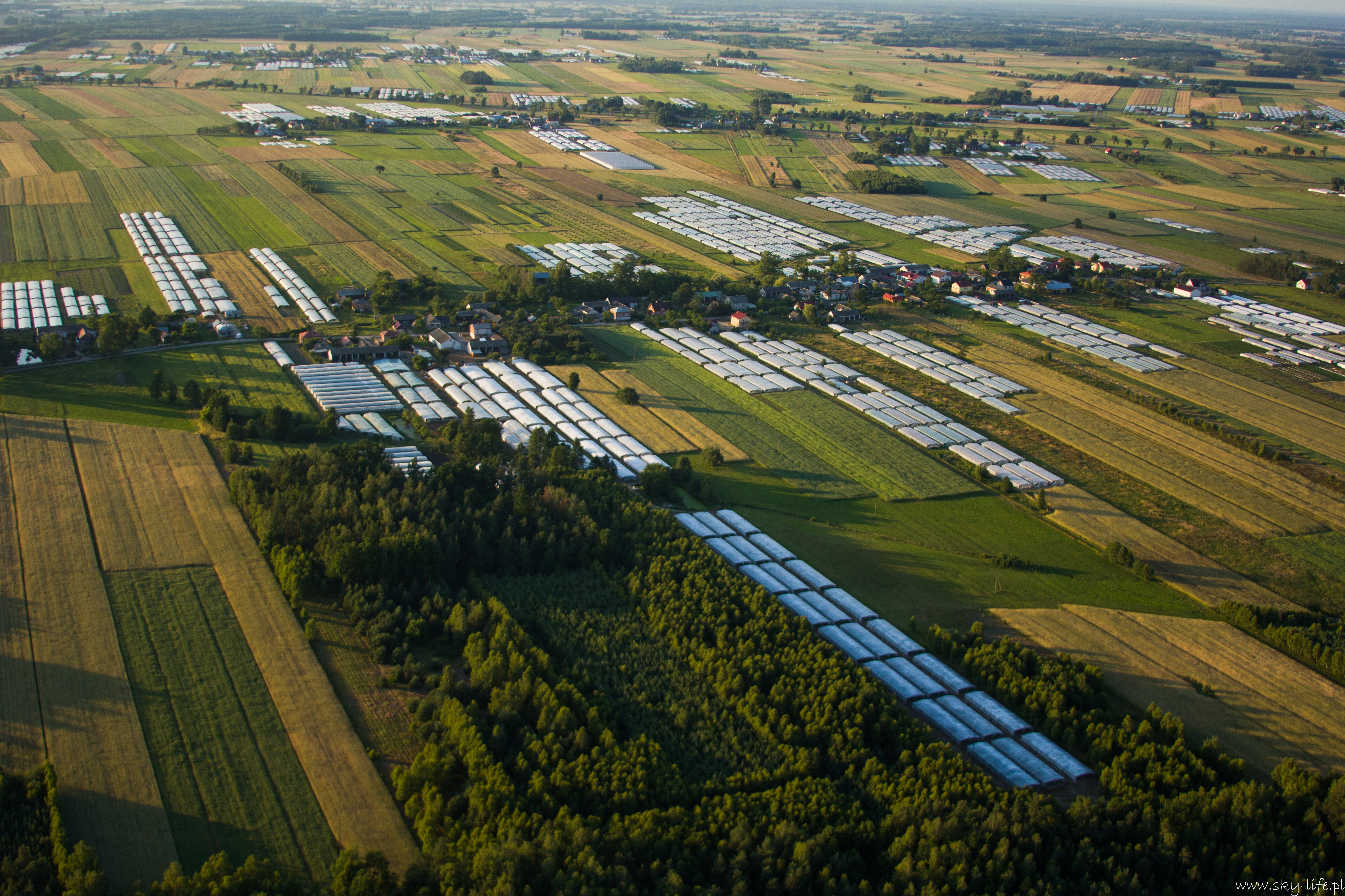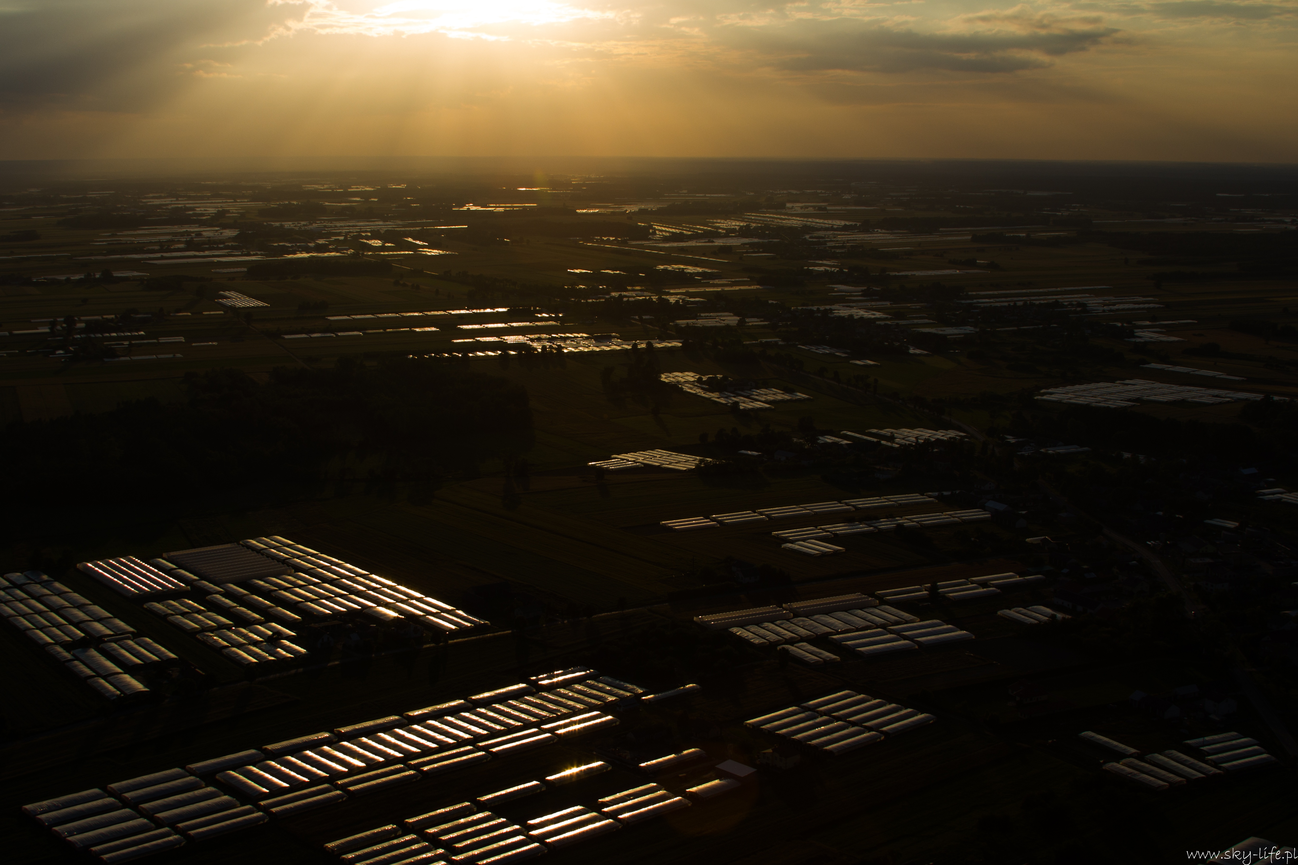 2014.06.24 – W końcu okienko pogodowe! Przez prawie tydzień pogoda w ogóle nie dopisywała – silny wiatr uniemożliwiał bezpieczne latanie. Dzisiaj w końcu na tyle się uspokoiło, że udało się polecieć w prawie 2h trasę. Na lotnisku byłem około 18-stej. Ruch jak w ulu – widocznie nie tylko ja długo oczekiwałem na pogodę. Na pasie kilka szybowców, kilka już w górze, do tego kilka samolotów no i ja w kolejce na start. Wystartowałem około 19-stej. Pomimo tego, że na ziemi prawie bez wiatru (2 m/s) to w górze już inaczej – wieje i to dość mocno, na szczęście nie ma porywów i termiki, więc po prostu wolniej się leci, a że mój kurs był dokładnie pod wiatr, to poruszałem się względem ziemi o połowę wolniej niż na zegarach. Według wstępnych założeń miałem lecieć wzdłuż Radomki do Zalewu w Domaniowie. Normalnie tą trasę bym pokonał w 15 minut, dzisiaj z uwagi na wiatr zajęło mi to dwa razy dłużej – dobrze, że zatankowałem do pełna. Rundka wokół Zalewu i pomyślałem, że warto by odwiedzić Nowe Miasto nad Pilicą – trasę powinienem pamiętać – GPS i mapy zostawiłem na lotnisku, bo miałem się tylko „przelecieć” po okolicy… Bogactwo krajobrazów mnie ponownie zaskoczyło – jak już wspominałem przy okazji lotu do Warki, że po północnej stronie Pilicy znajdują się praktycznie same sady, tak na trasie Domaniów -> Nowe Miasto krajobraz obfituje w… szklarnie – i to jeszcze ile! Ciągną się aż po horyzont.