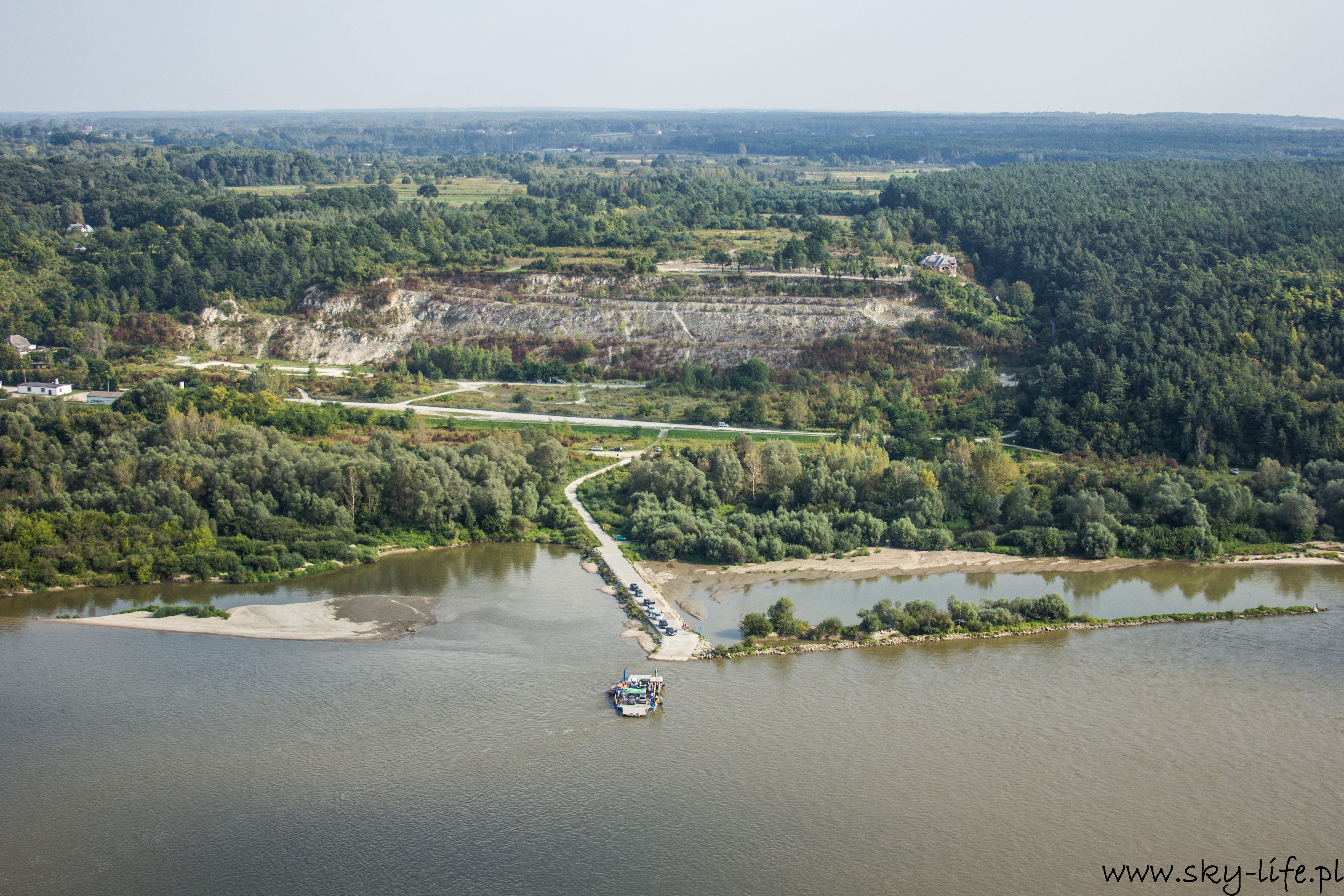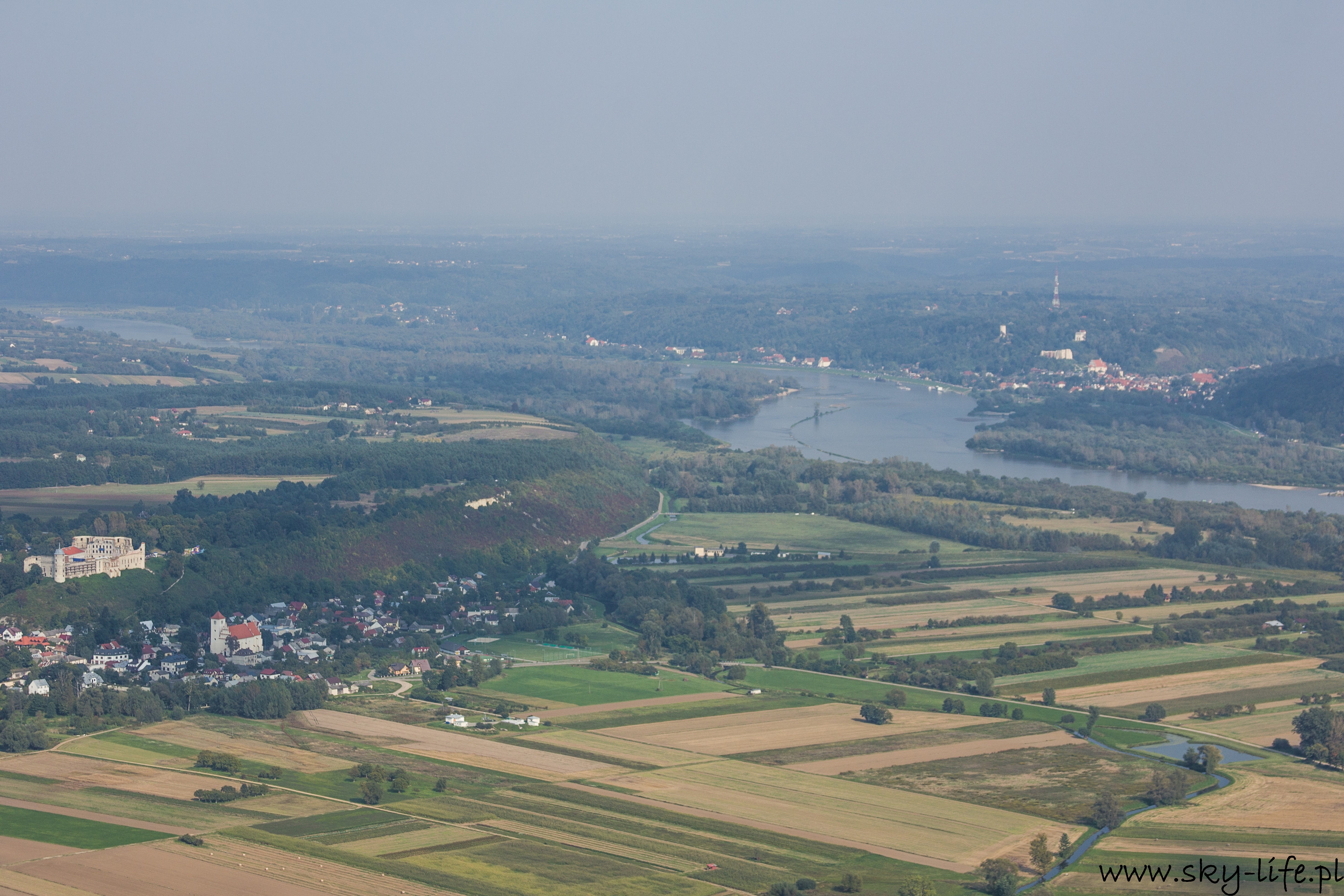Start chwilę po 14-stej i już parę sekund po starcie da się wyczuć dość silną termikę – na zdjęciu po prawej stronie widać mocno zadarty przód motolotni, podczas gdy sterownica jest dość mocno ściągnięta, czyli w spokojnym powietrzu powinienem lecieć z delikatnym opadaniem, a w takich warunkach jak były, miałem około 2 m/s wznoszenia. Cała trasa była już spokojniejsza, owszem pojawiała się termika, ale bardzo delikatna – taka, żeby zużyć delikatnie mniej paliwa korzystając z noszeń. Niestety widoczność nie była bardzo dobra – pozioma sięgała 6-7 km, utrudniało to trochę nawigację. Po prawie 1h lotu byłem już w Janowcu. W planie lotu miałem zagospodarowane 20 minut na krążenie wokół Kazimierza i ten czas wykorzystałem na robienie zdjęć, które zamieszczam poniżej. Kazimierz Dolny jak chyba w każdy weekend był pełny ludzi, ale to na prawdę pełny – nawet z góry trudno byłoby znaleźć miejsce żeby wcisnąć samochód.