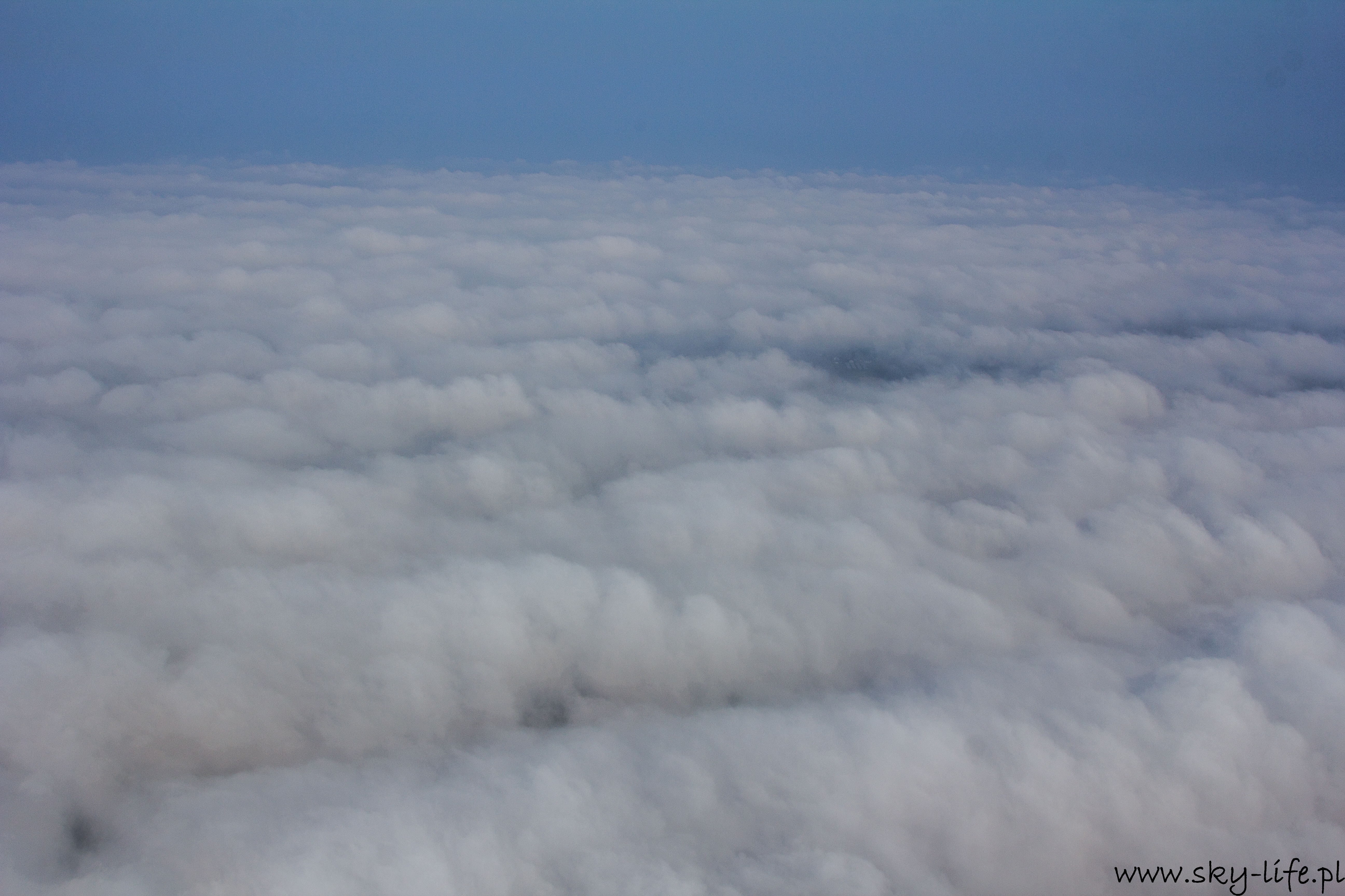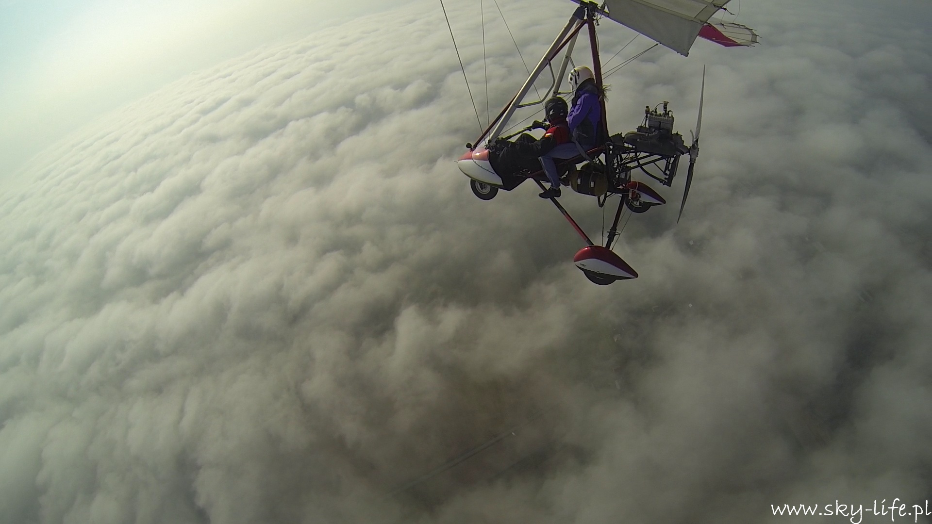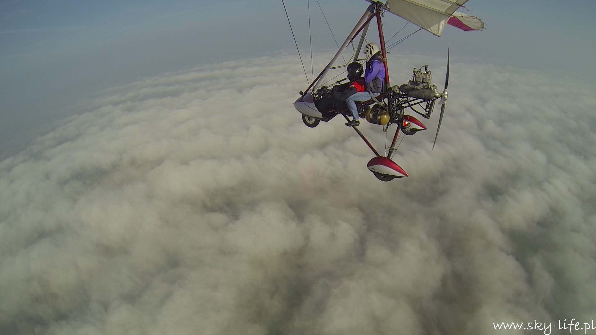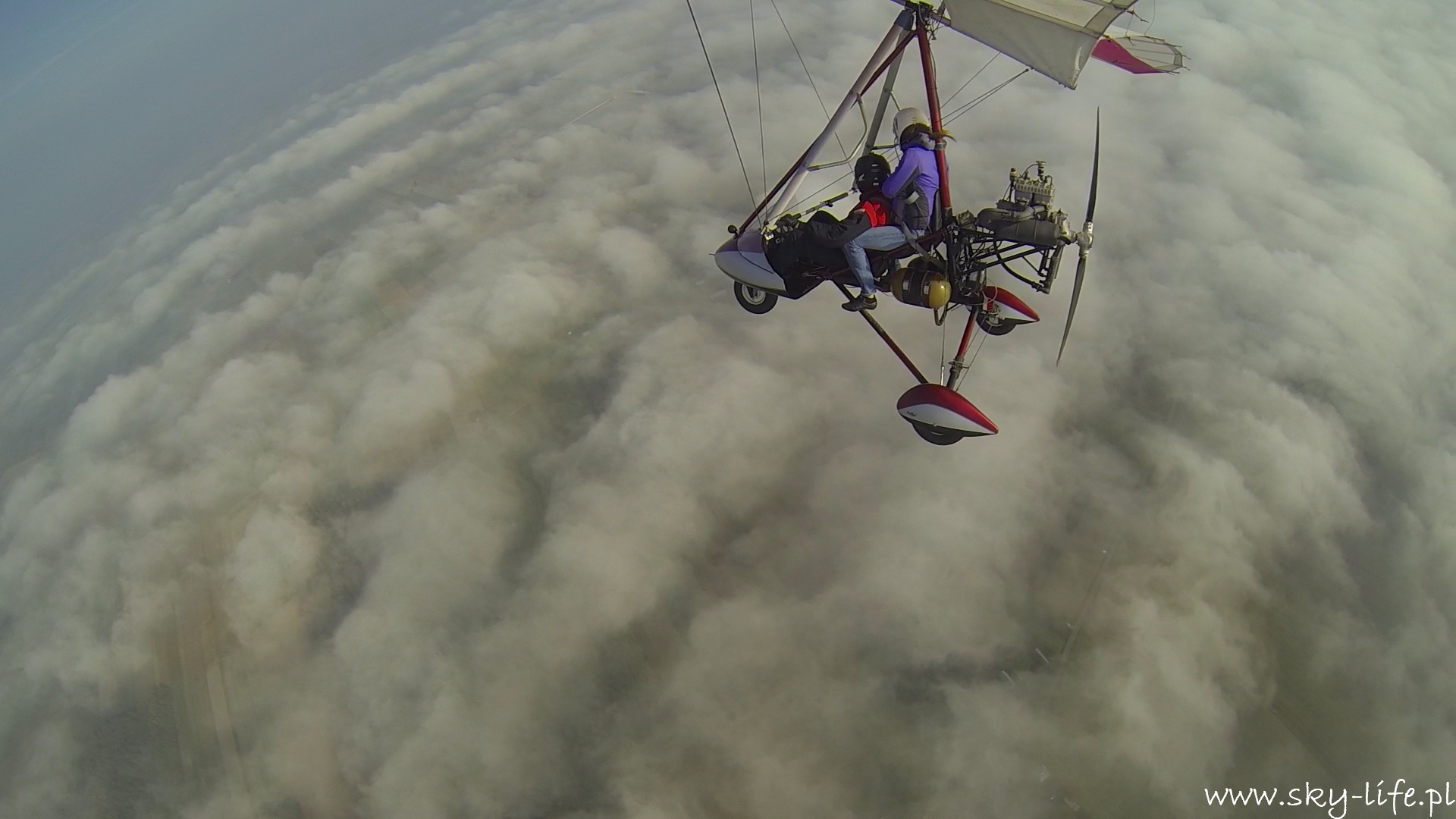 400m. Bliskość jezior i rzek zrobiła swoje – cała południowa i wschodnia część widnokręgu była pokryta dość gęstą mgła, jednakże po stronie zachodniej za około 1km było już widać granicę oparu. Pomimo faktu, że trasa mojego przelotu prowadzi na północ postanowiłem i tak skierować się na zachód, aby wyjść z nad mgły i z pełną widocznością ziemi kontynuować lot wzdłuż jej krawędzi. Muszę przyznać, że latanie nad chmurami (wszak mgła to też chmura) jest źródłem niesamowitych przeżyć a przede wszystkim – cudownych widoków. Poniżej jeszcze kilka dodatkowych ujęć z tej części lotu.