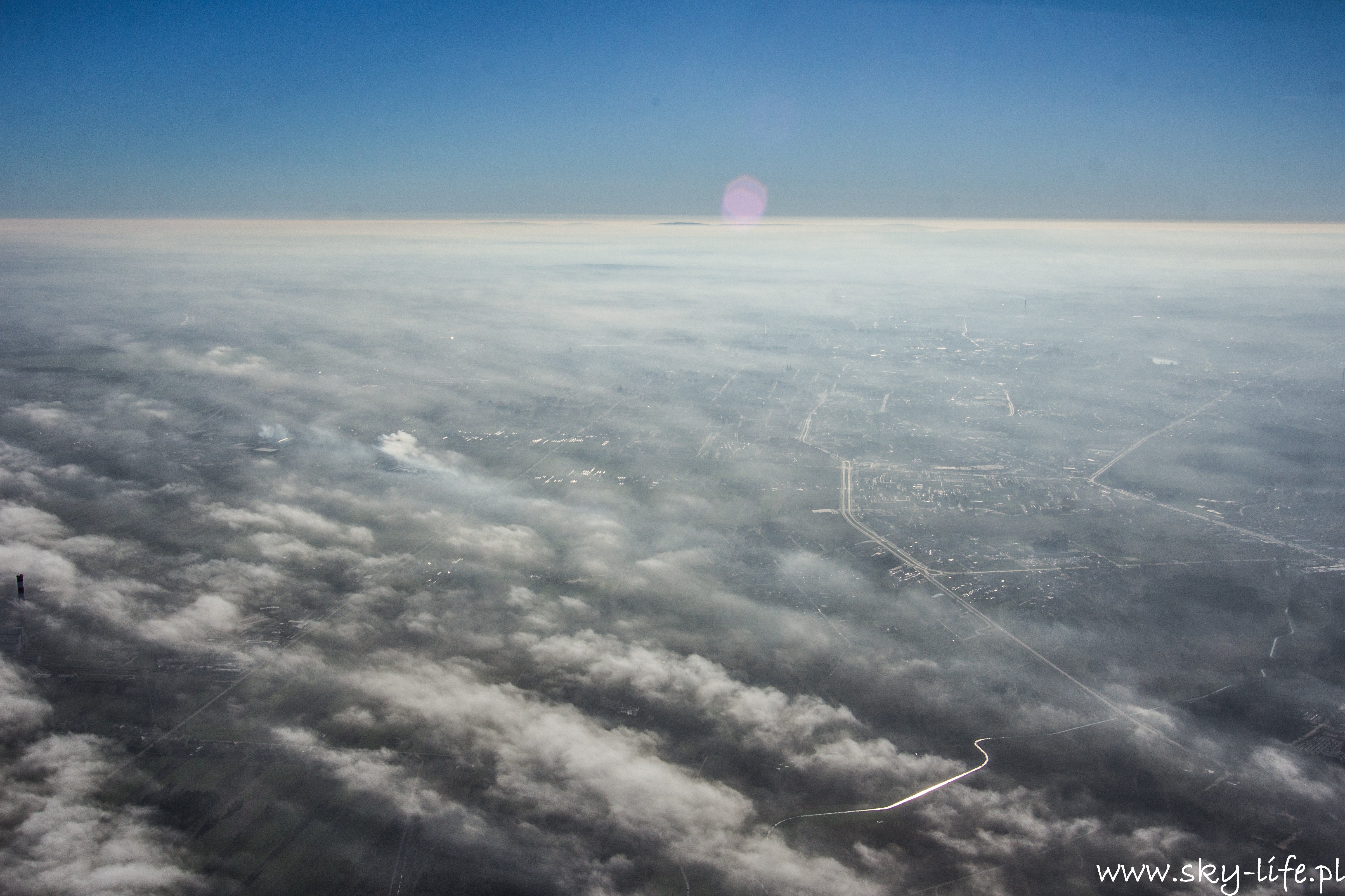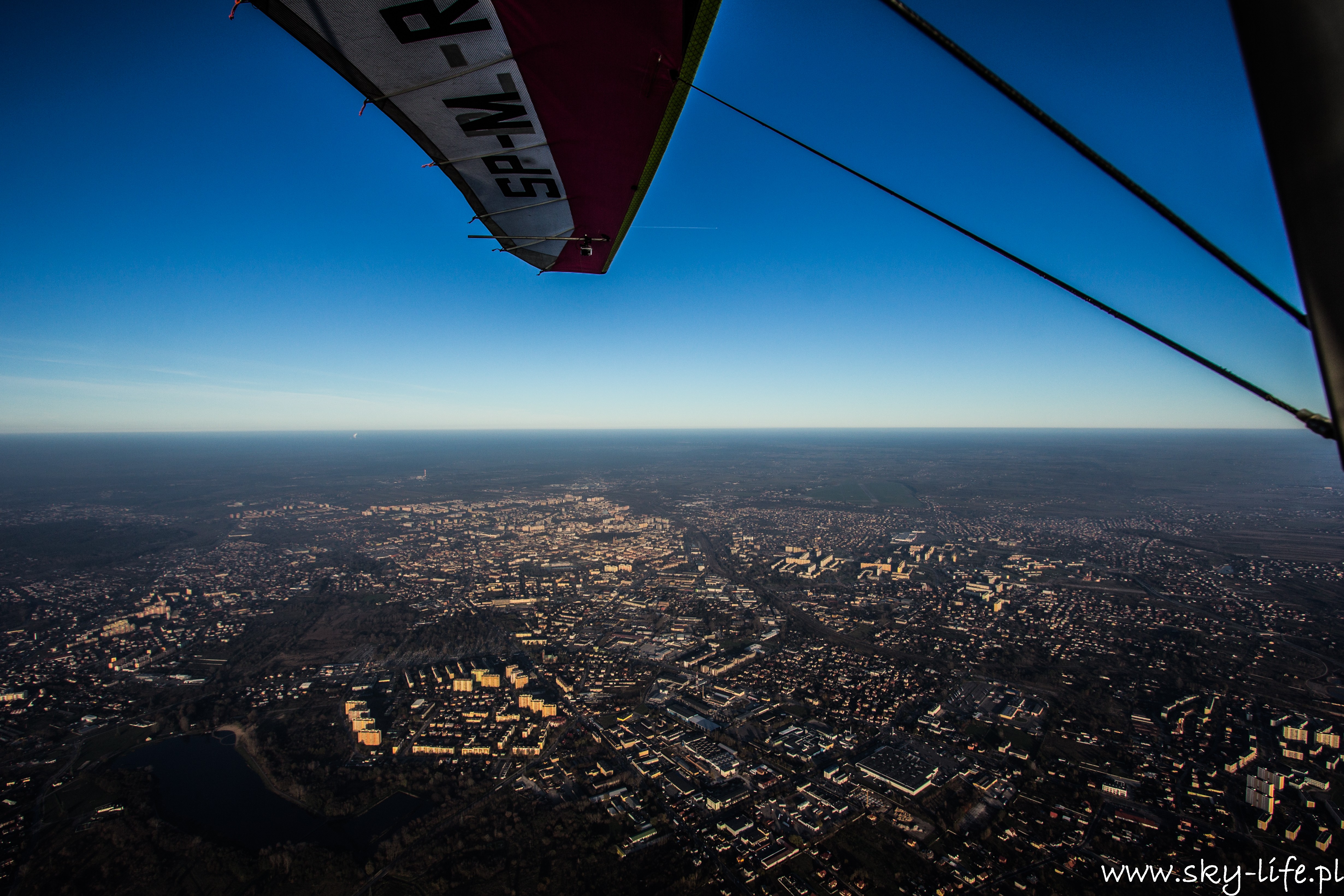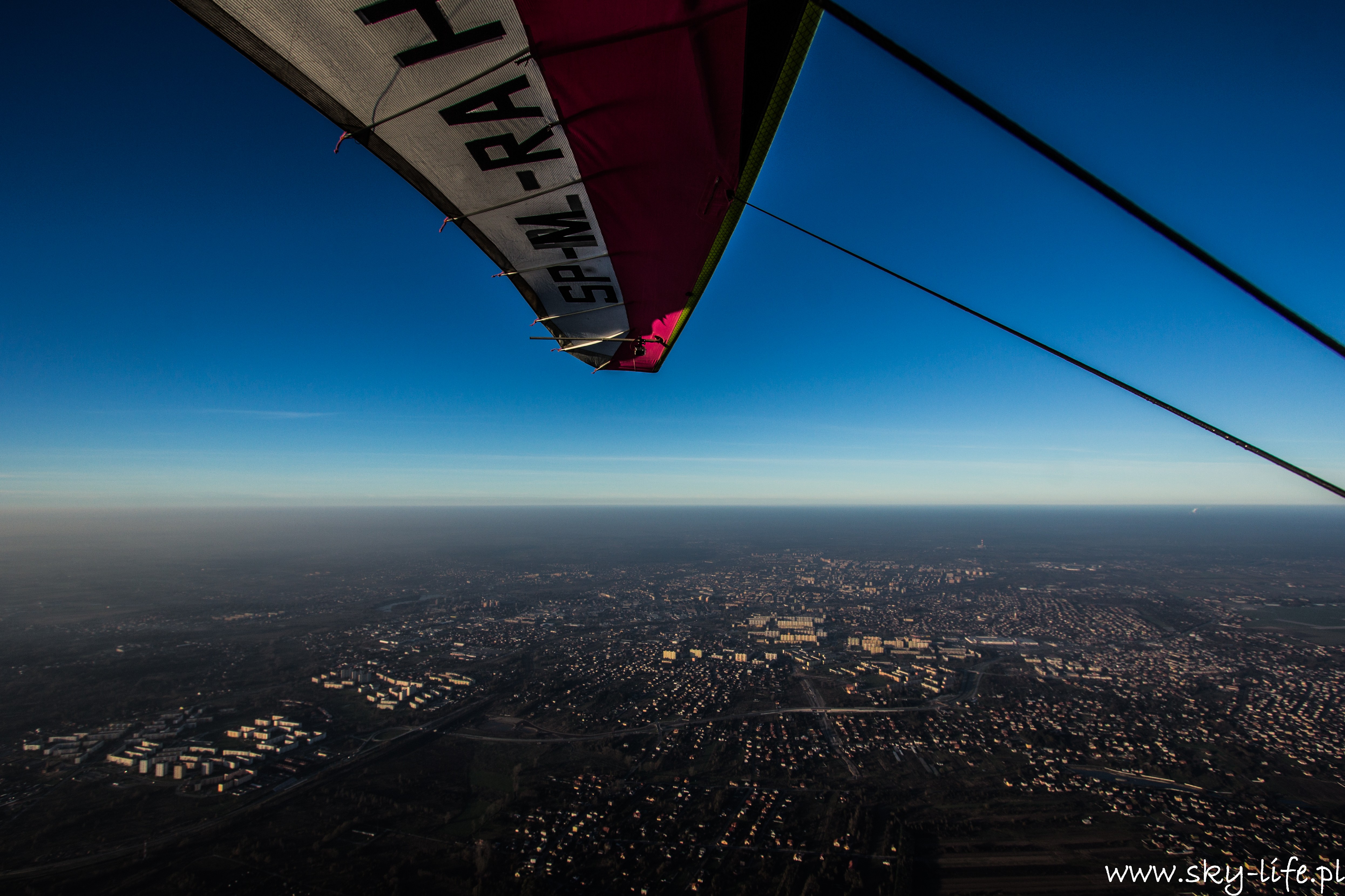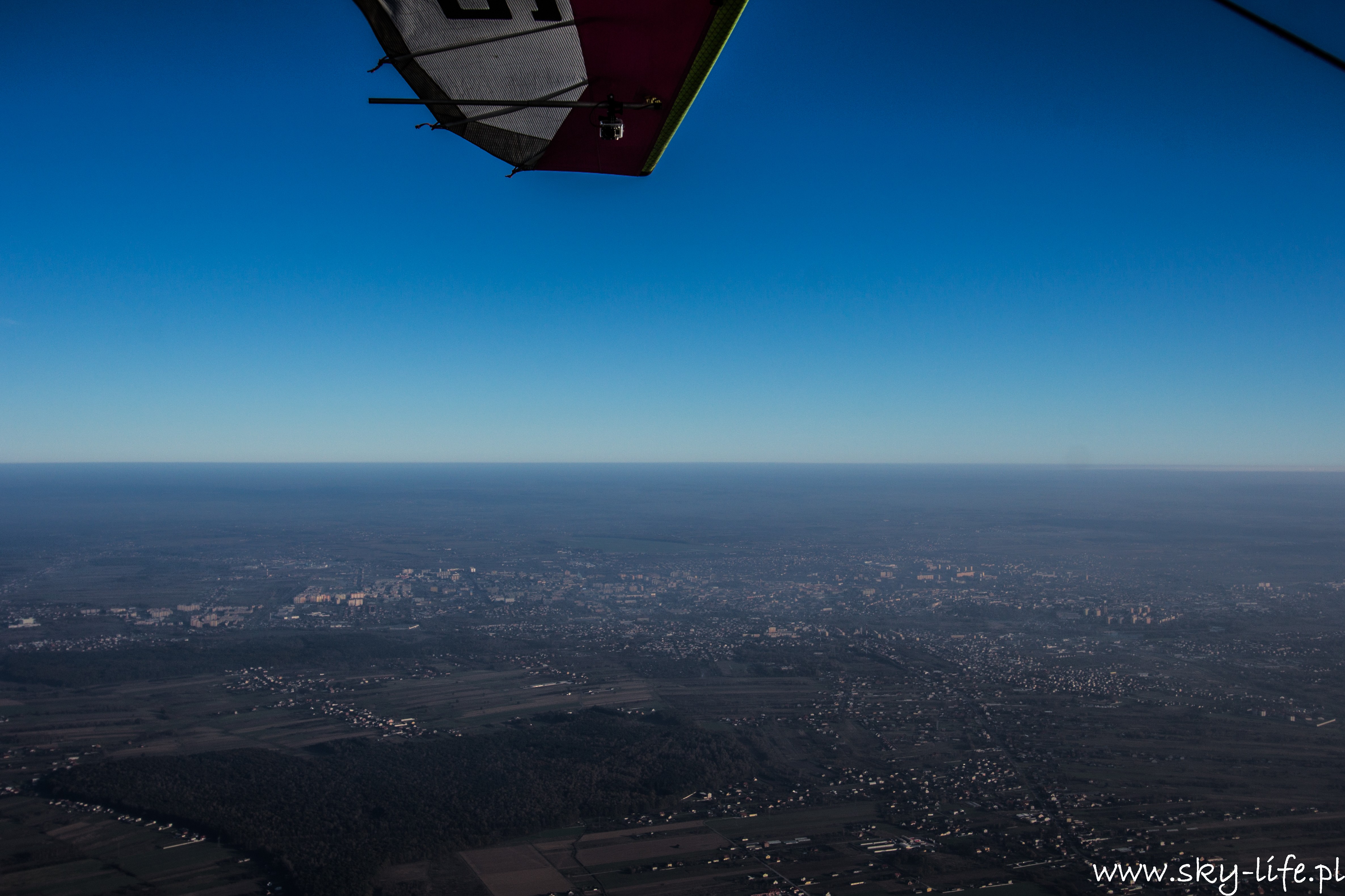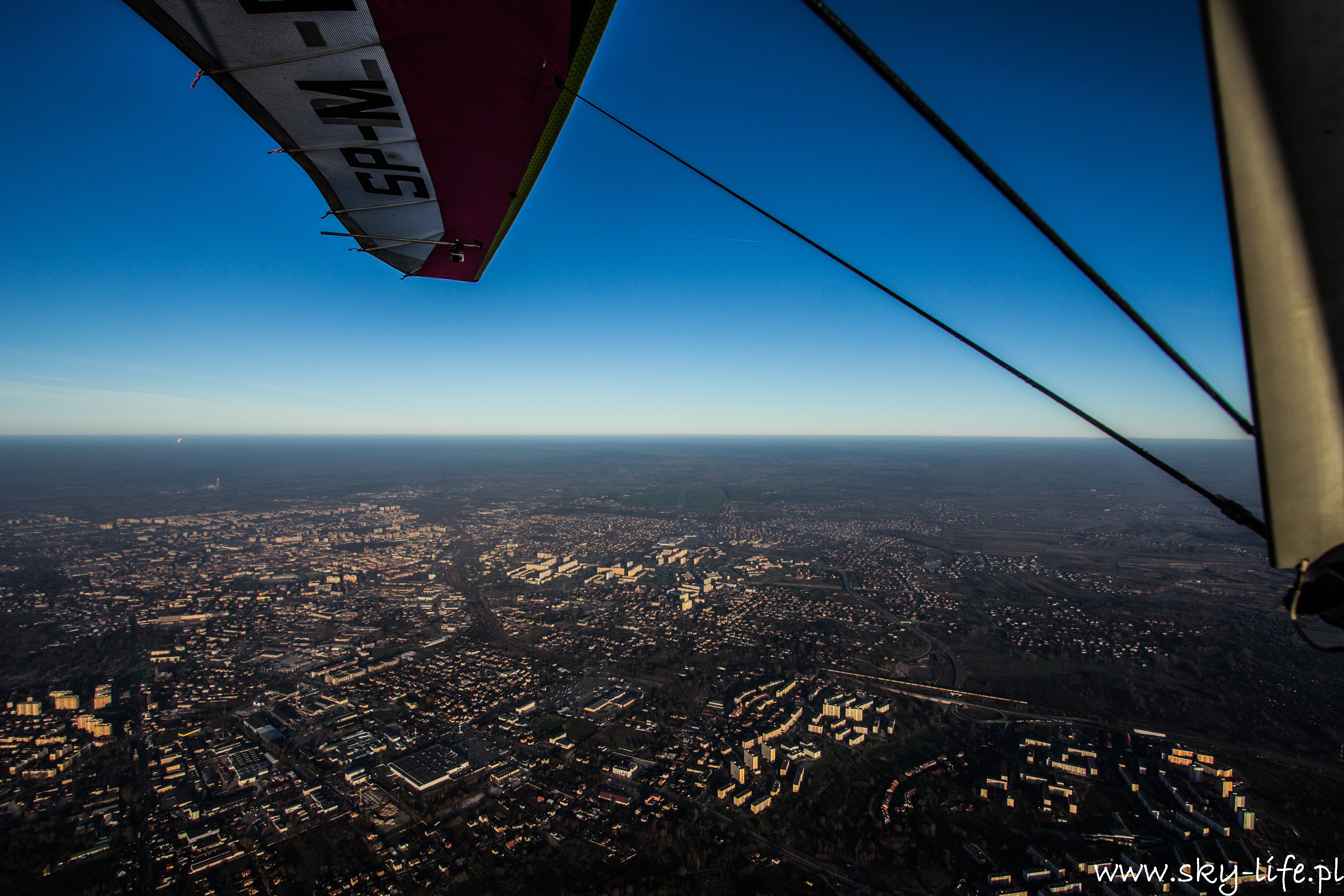 Po tym pytaniu rozmowa już przebiegła bardzo profesjonalnie. Ustaliliśmy cały plan lotu, callsign, wysokość i niezbędne procedury. Mam zgłosić się na wojskowej częstotliwości Radom TWR przed wlotem do MATZ na punkt Romeo (więzienie na Koziej Górze). Przed samym startem i na zbliżaniu do strefy dało się uchwycić Radom we mgle (zdjęcie powyżej). Zgłosiłem się, zgodnie z planem przed punktem Romeo i dostałem majestatyczną odpowiedź: „Zezwalam na wlot w przestrzeń kontrolowaną MATZ EPRA, nie wyżej niż 3500 stóp, pas w użyciu….”, czyli od tej pory lecę pod pełną obserwacją. Plan zakładał lot od punktu Romeo w kierunku os. Południe, po przecięciu pasa („zezwalam na cięcie pasa”), z kursem 25 w południowy rejon portu a następnie przelot nad lotniskiem w poprzek pasa (ponownie „zezwalam na cięcie pasa”) w kierunku punktu November (Elektrociepłownia na Gołębiowie). Cały lot był rewelacyjny – odbył się na wysokości 800-1000m AGL z pełną komunikacją radiową, poniżej kilka ujęć z tego lotu. Po przybyciu nad punkt November i zgłoszeniu się usłyszałem kolejny znany komunikat: „Służba kontroli ruchu lotniczego zakończona, przełącz się na Radom-Kwadrat….”. Ehhh to był lot!