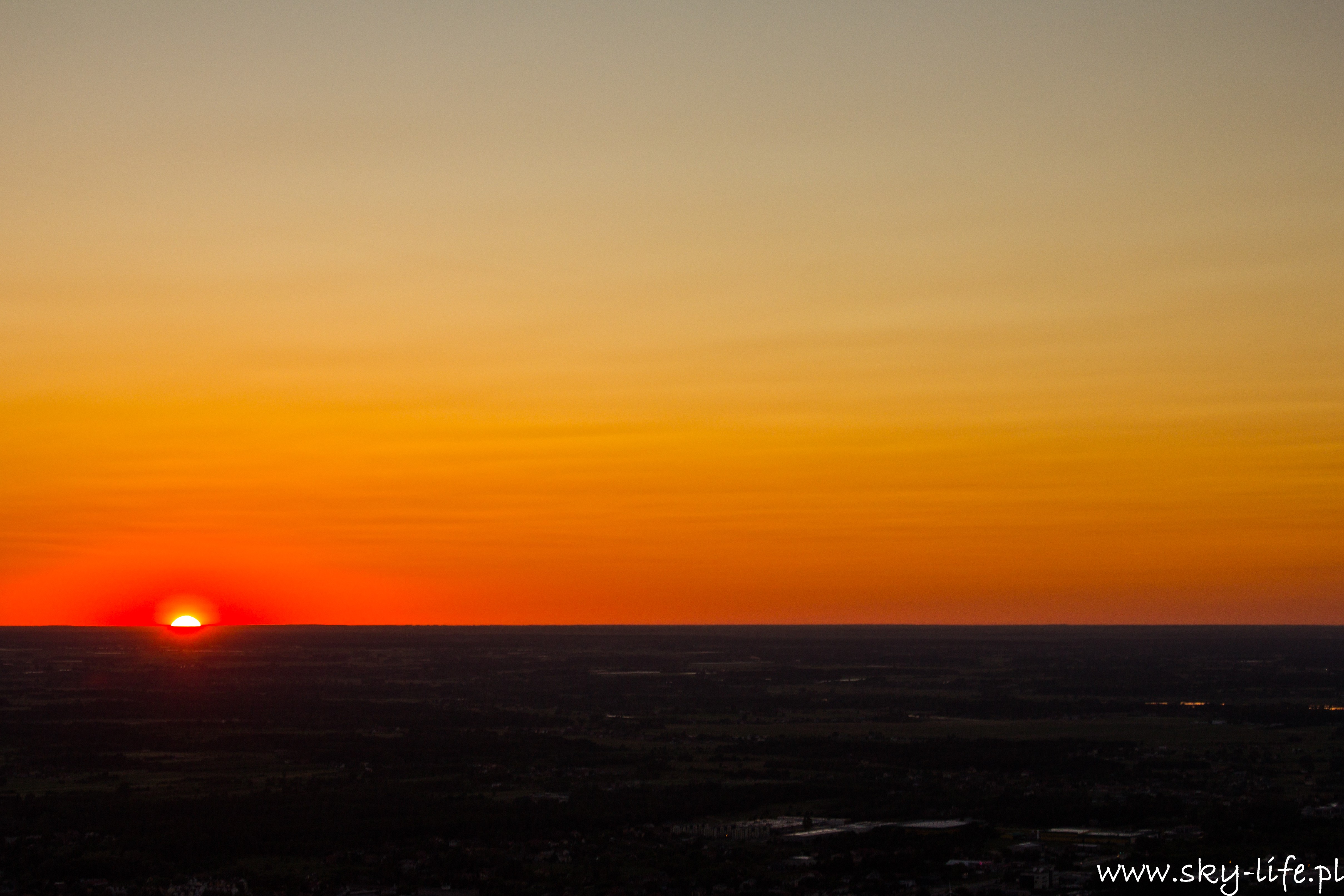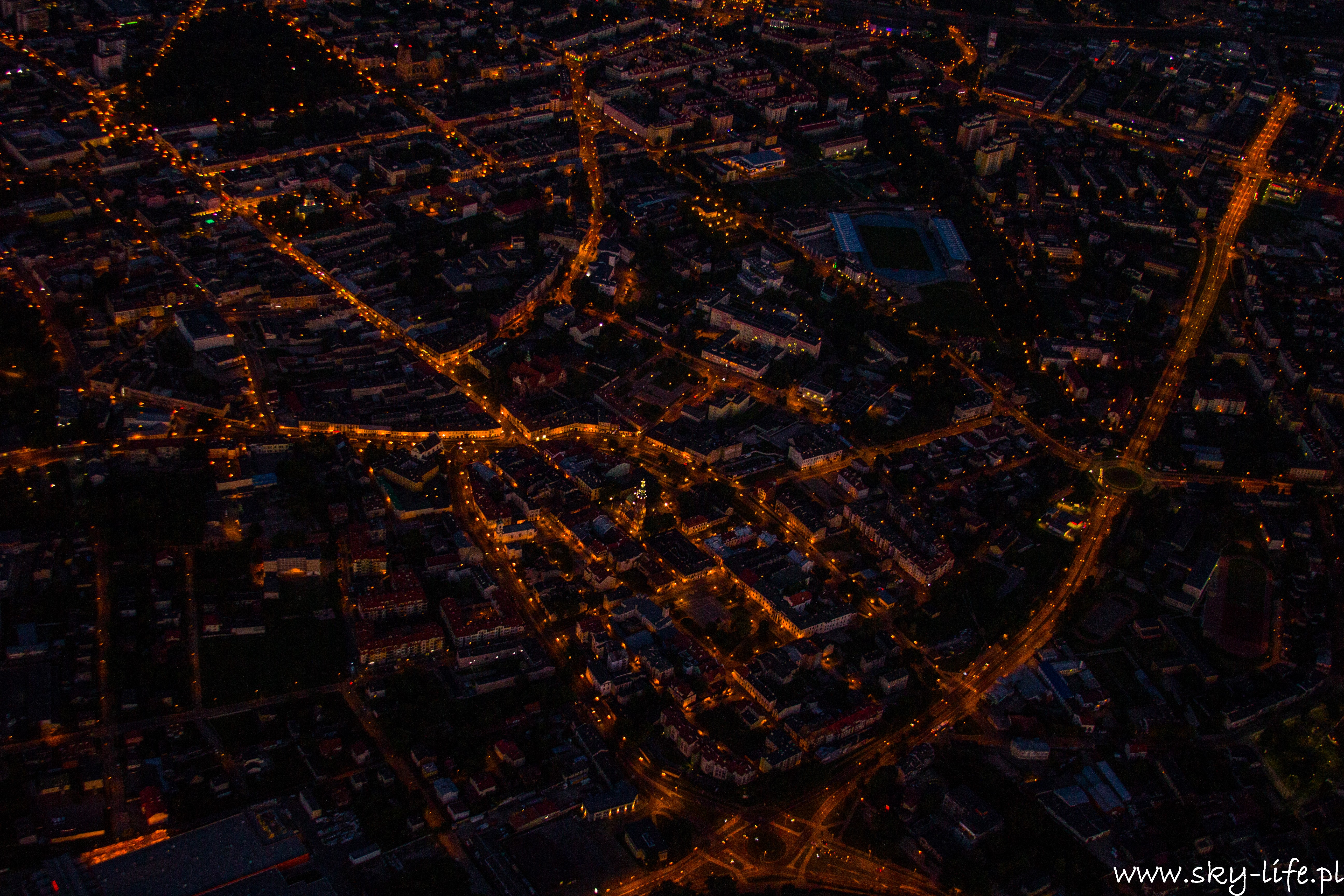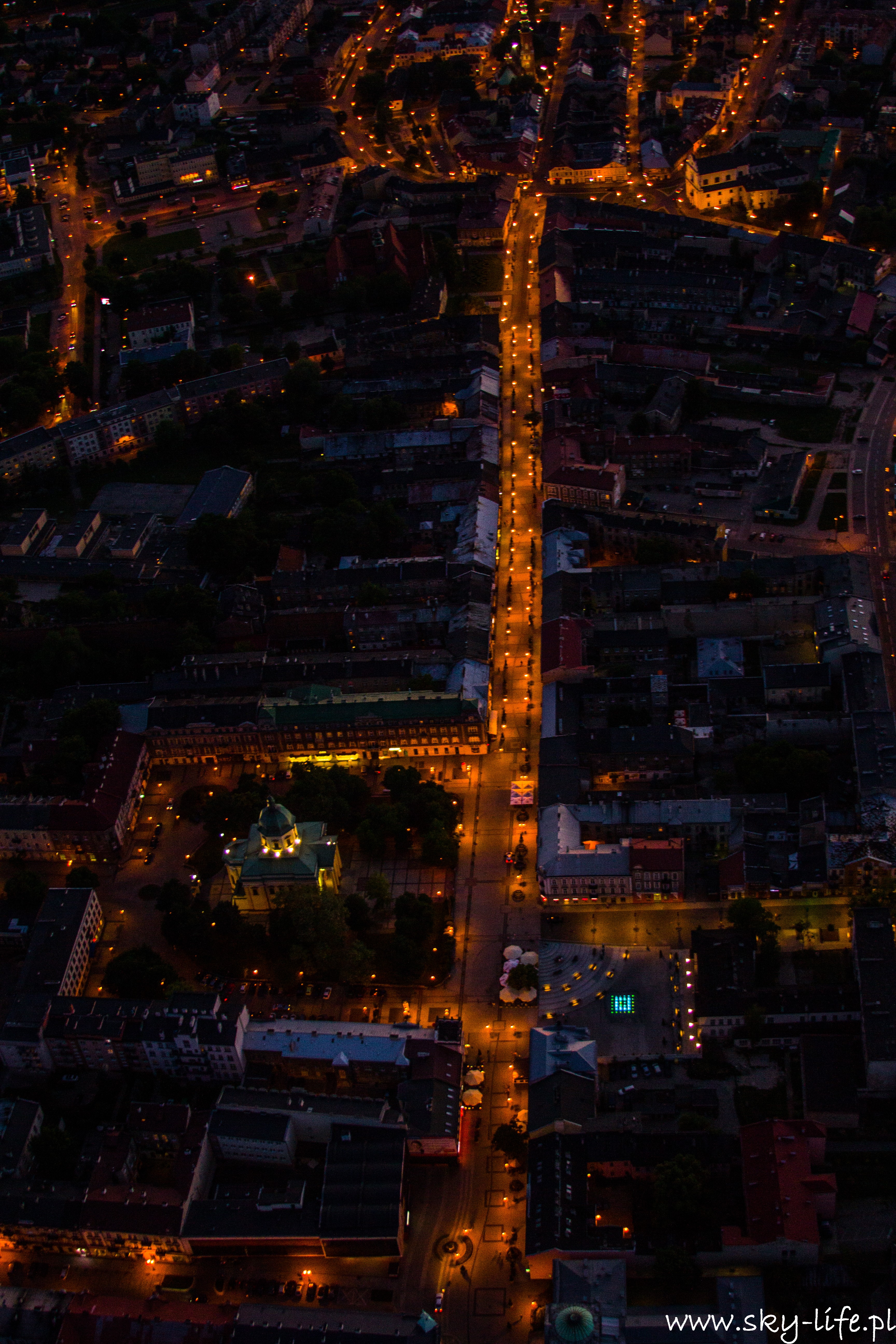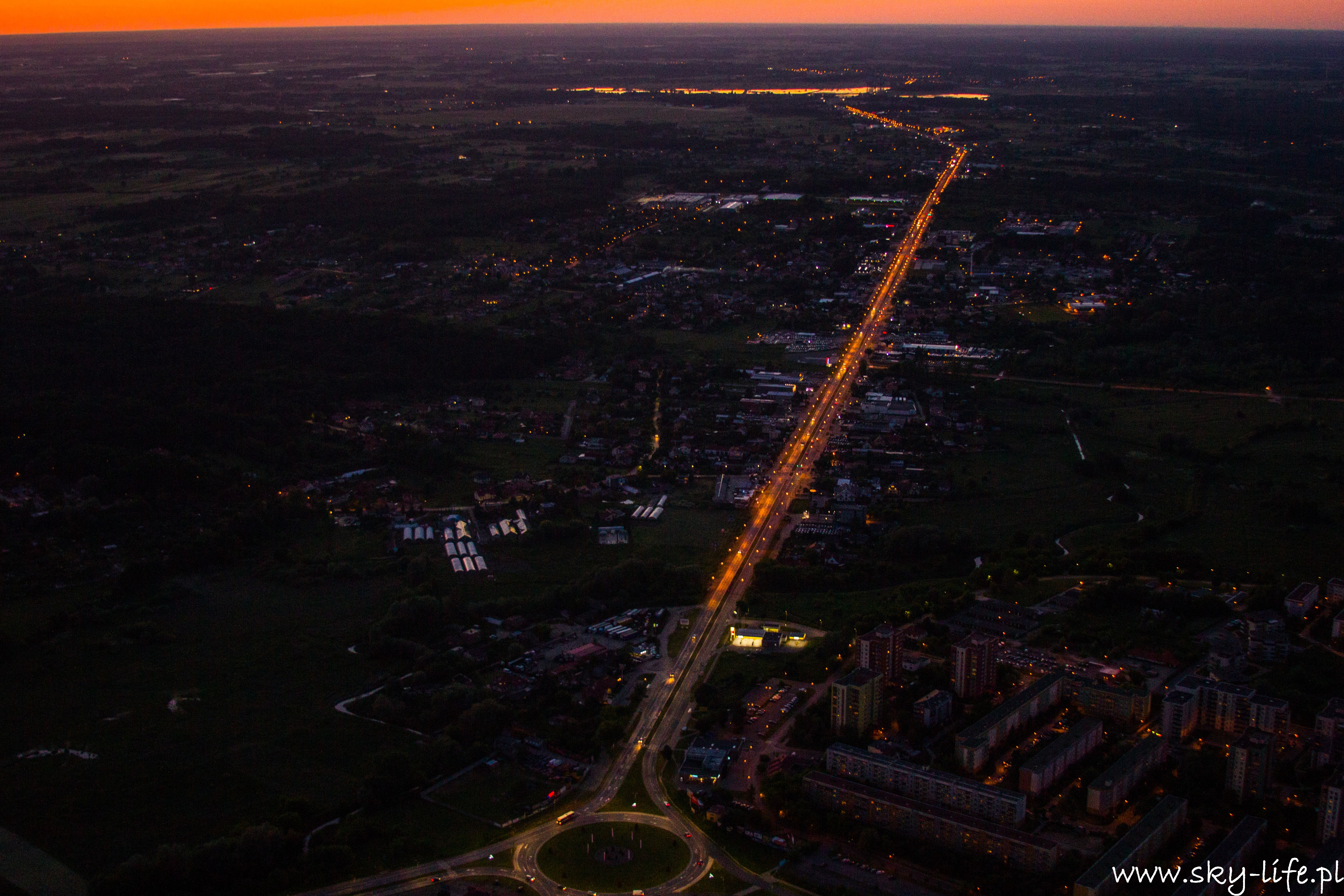 Podczas drugiego lotu pogoda już się wygładziła i pozostała tylko czysta przyjemność lotu. Nad Radomiem standardowo już zwiększyłem wysokość do ponad 700m. Tym razem mam w planach utrzymanie się w locie nawet po zachodzie słońca, ale tak, żeby wylądować jeszcze w dozwolonym czasie, czyli do 30 minut po zachodzie. Utrzymywałem się w locie tak długo z jednego względu – ustawiłem aparat do robienia zdjęć nocnych, tak żeby było widać urocze oświetlenie miejskie. Muszę przyznać, że Radom w nocy to dwa osobne widoki – dzielnice mieszkalne w których jest po prostu ciemno i rozjaśnione centrum. Cały radom jest jeszcze poprzecinany długimi jasnymi liniami (głównymi drogami). I tak będąc na wysokości 700m da się bez problemu rozpoznać ul. Warszawską, Kielecką, Słowackiego, 1905-roku, Wierzbicką itd.