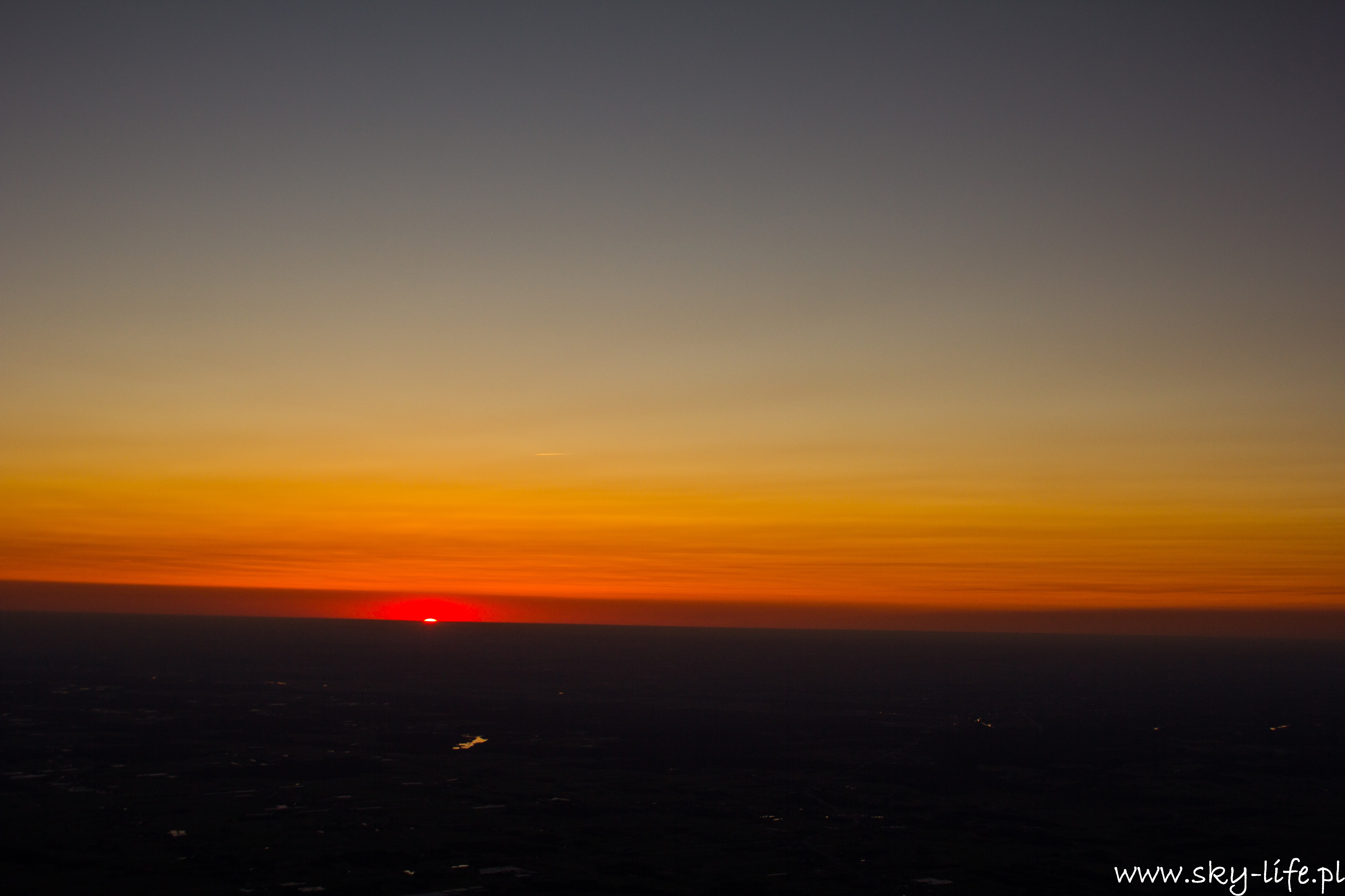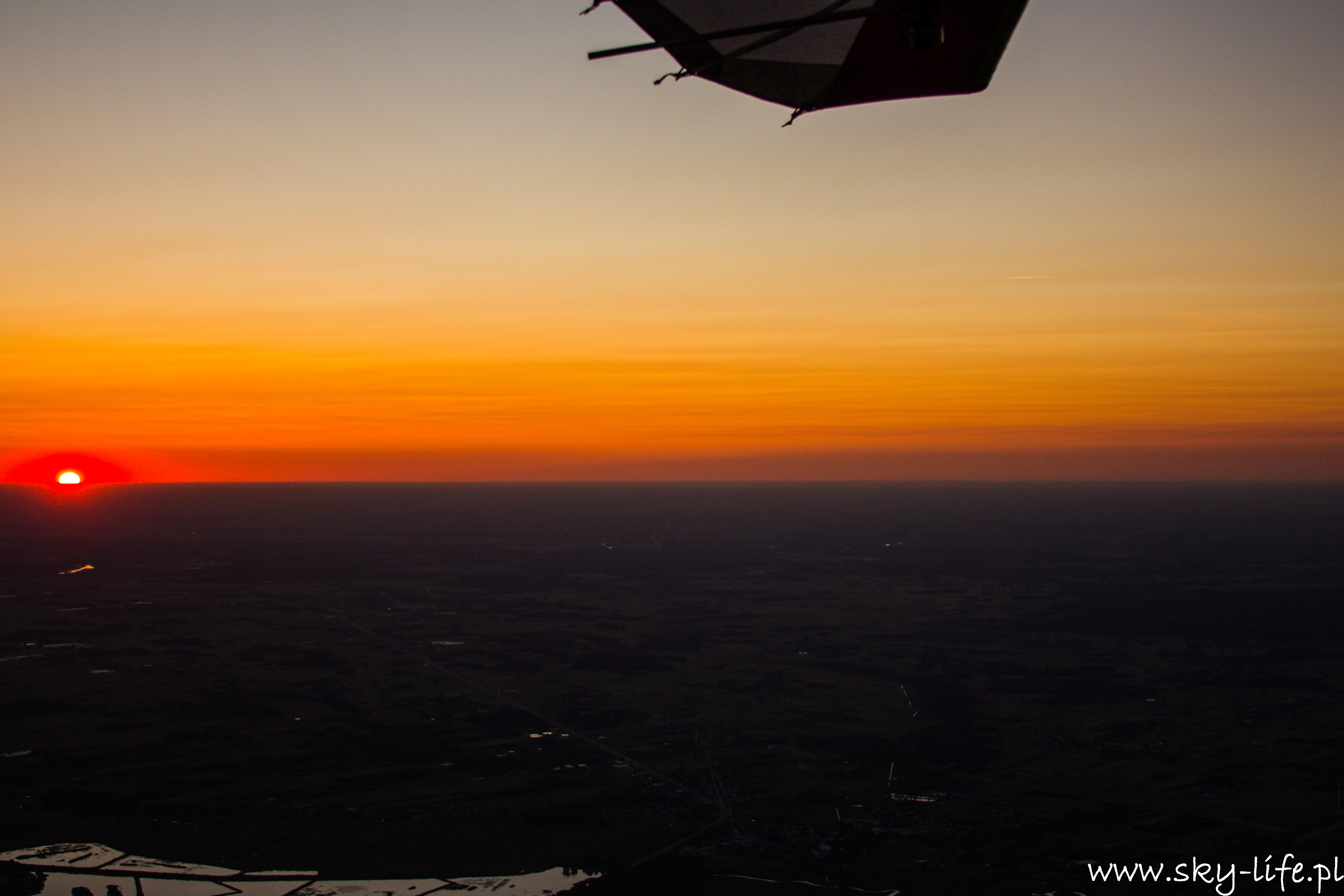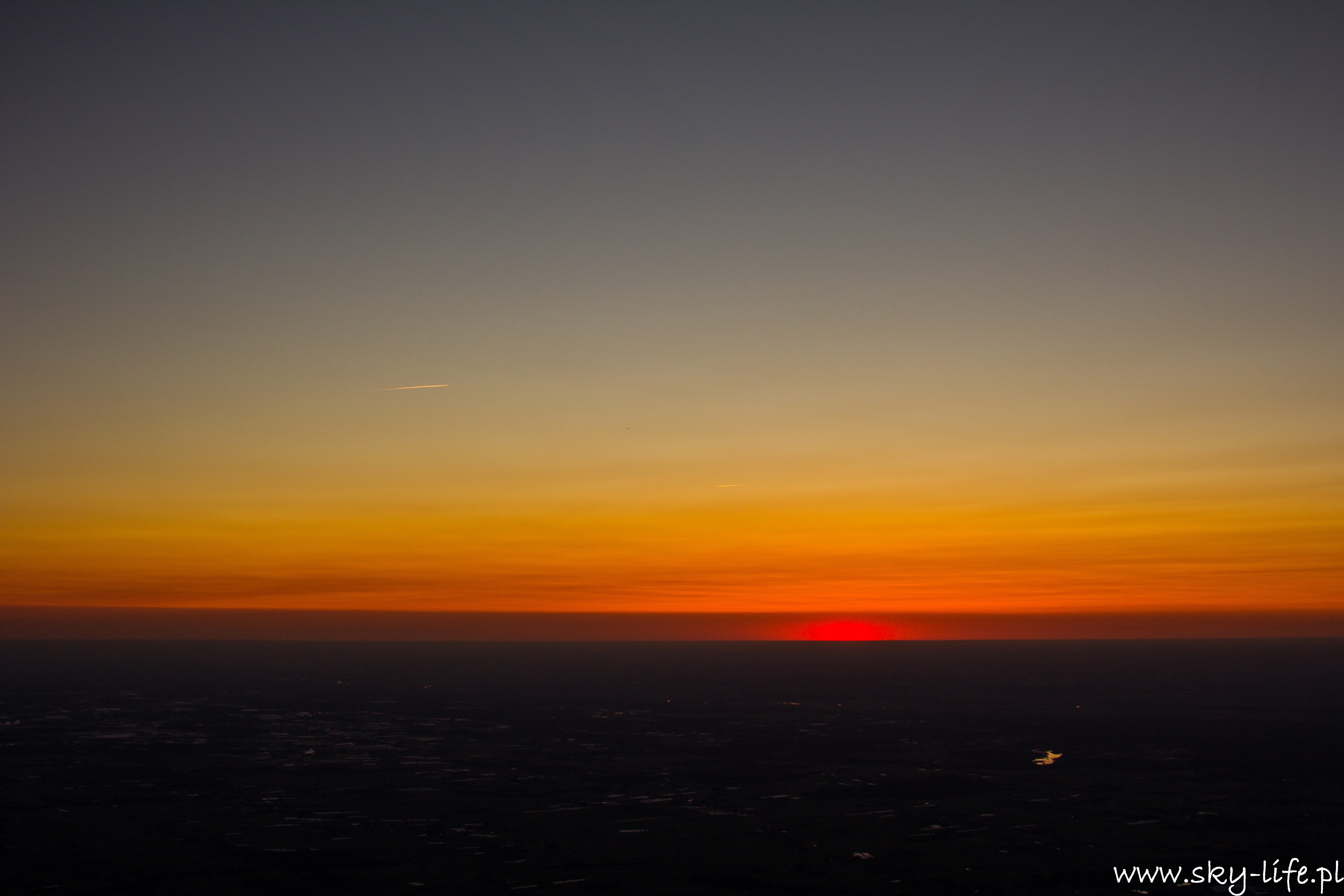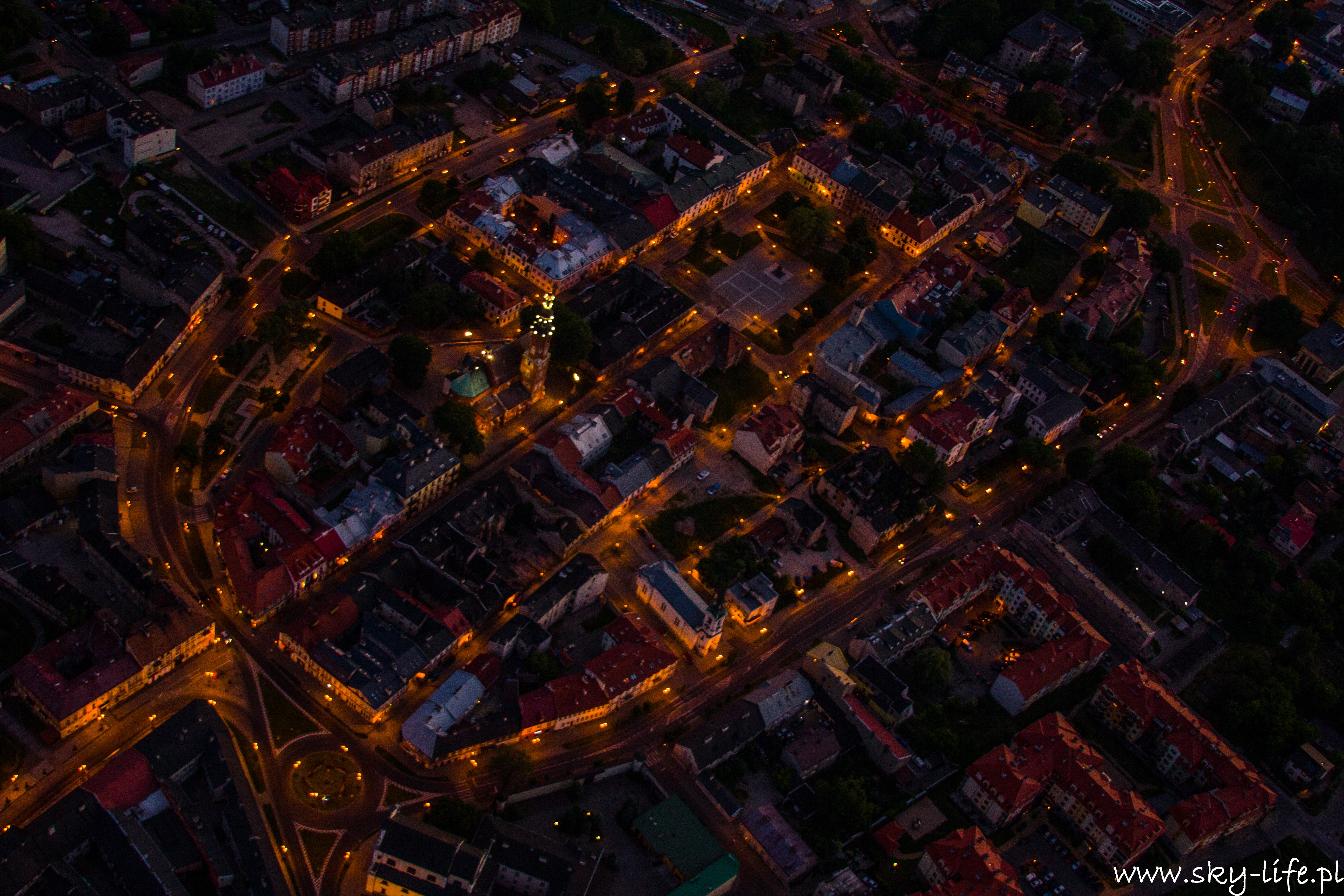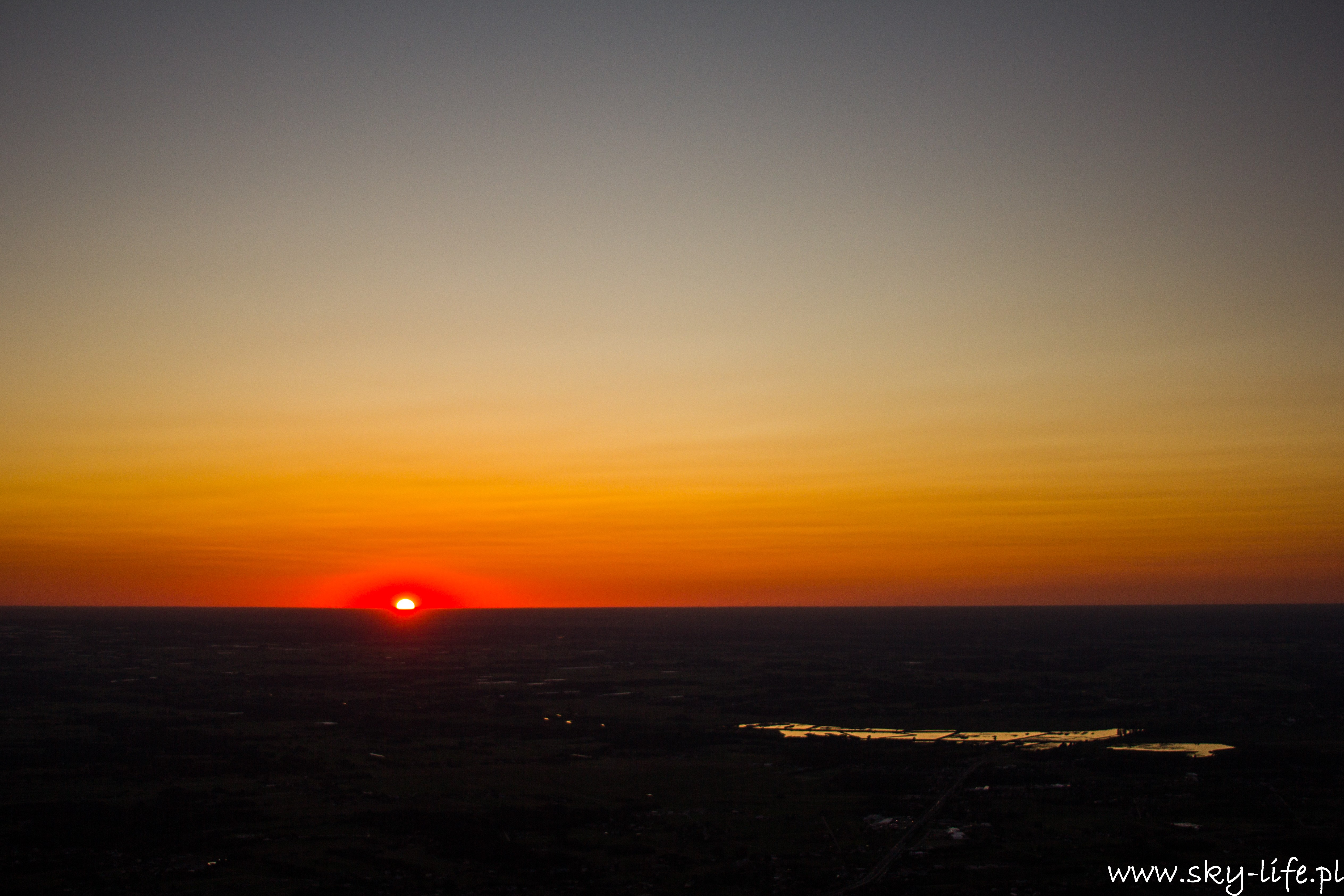 Podczas drugiego lotu pogoda już się wygładziła i pozostała tylko czysta przyjemność lotu. Nad Radomiem standardowo już zwiększyłem wysokość do ponad 700m. Tym razem mam w planach utrzymanie się w locie nawet po zachodzie słońca, ale tak, żeby wylądować jeszcze w dozwolonym czasie, czyli do 30 minut po zachodzie. Utrzymywałem się w locie tak długo z jednego względu – ustawiłem aparat do robienia zdjęć nocnych, tak żeby było widać urocze oświetlenie miejskie. Muszę przyznać, że Radom w nocy to dwa osobne widoki – dzielnice mieszkalne w których jest po prostu ciemno i rozjaśnione centrum. Cały radom jest jeszcze poprzecinany długimi jasnymi liniami (głównymi drogami). I tak będąc na wysokości 700m da się bez problemu rozpoznać ul. Warszawską, Kielecką, Słowackiego, 1905-roku, Wierzbicką itd.