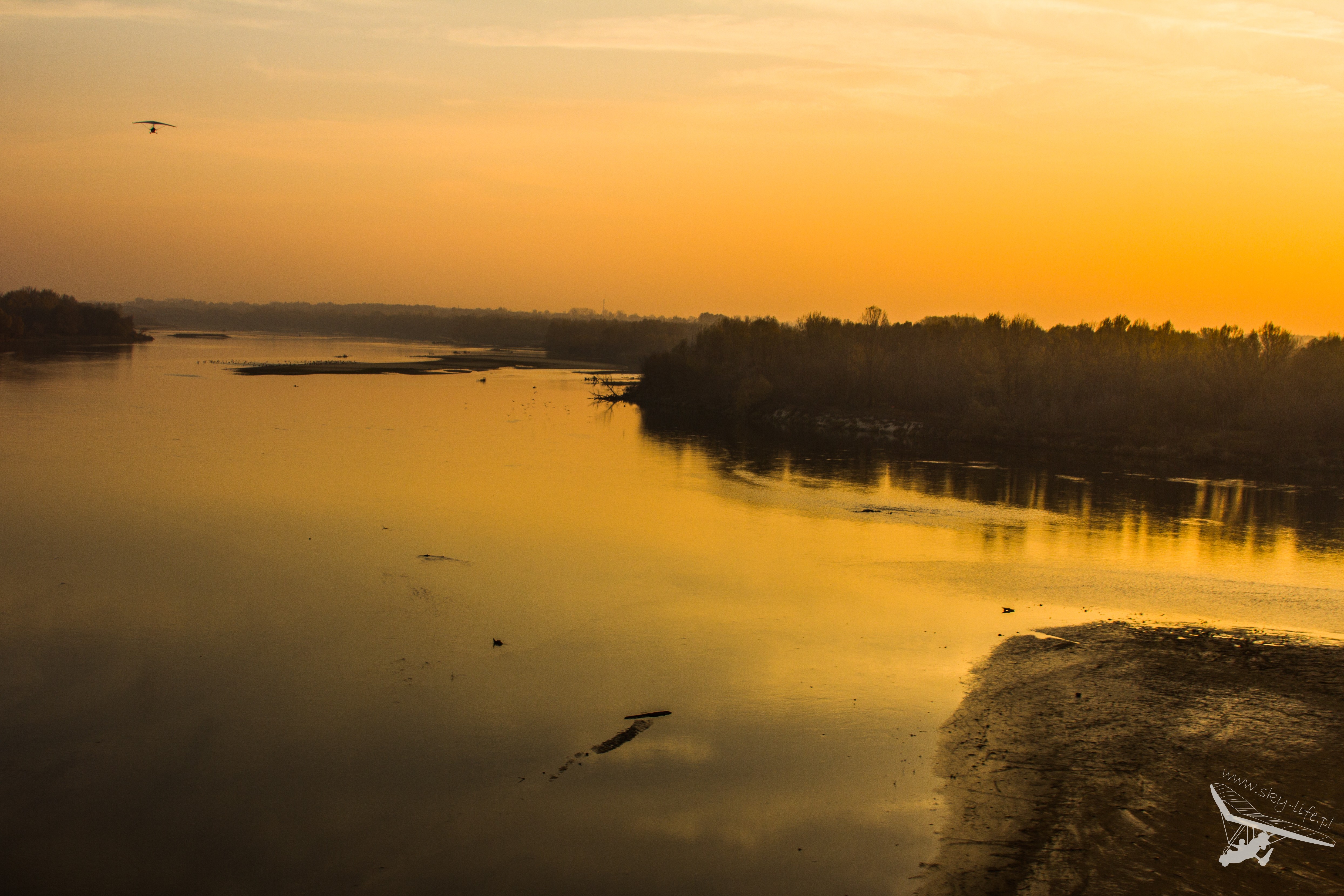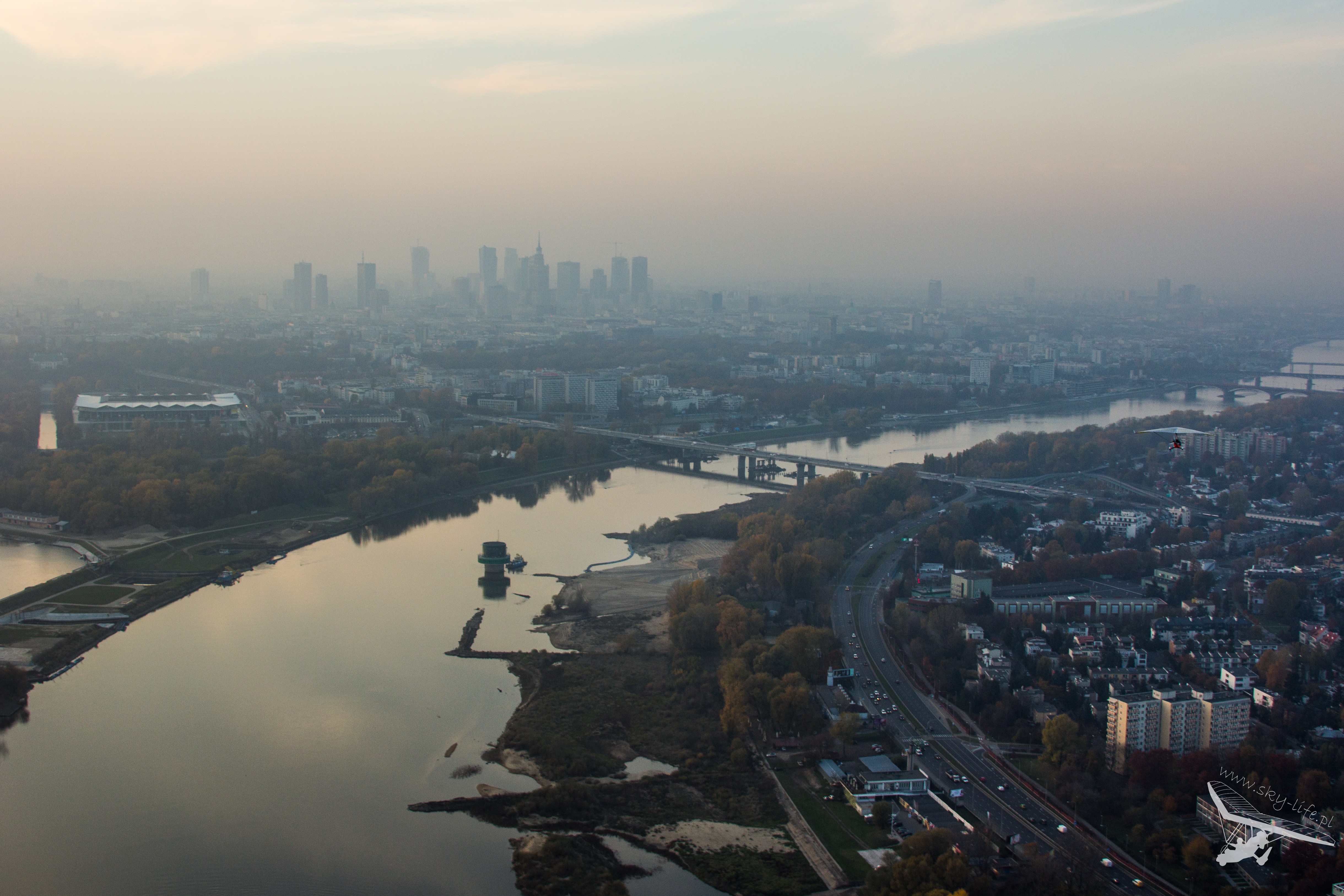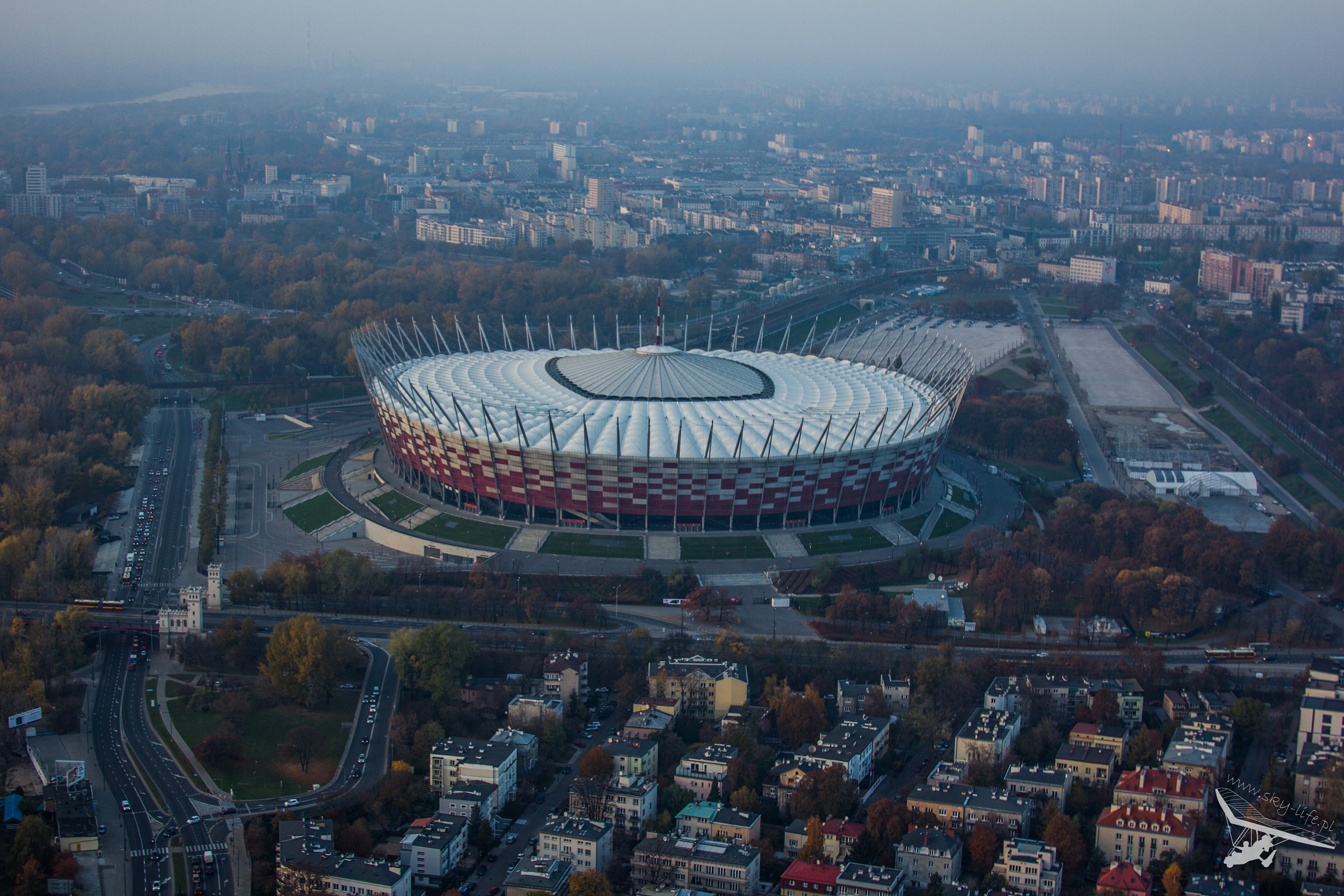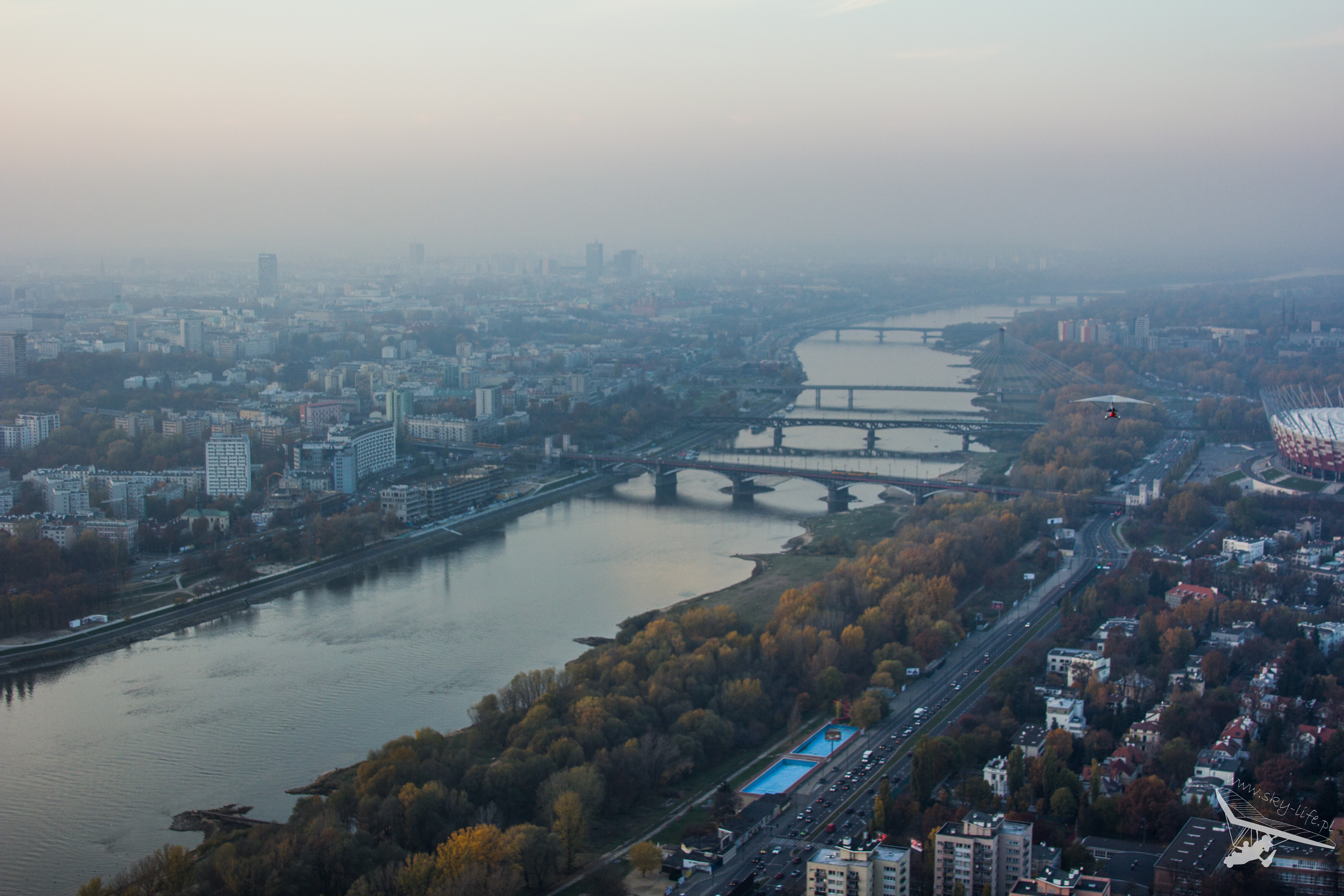namiarów nie znałem, a że nie miałem przy sobie ani mapy ani GPS postanowiłem polecieć na znane lądowisko w Wildze i tam do niego zadzwonić. Po wylądowaniu okazało się, że on leci… do mnie do Radomia. W końcu udało nam się spotkać i wyruszyliśmy w składzie pary (ja jako prowadzony, on – prowadzący) na zwiedzanie okolicy. Na kolejnym lądowisku padło pytanie – a może byśmy tak polecieli nad Stadion w Warszawie? Szybkie rozeznanie w paliwie, pozostałym czasie do zachodu słońca i decyzja – w sumie to czemu nie?